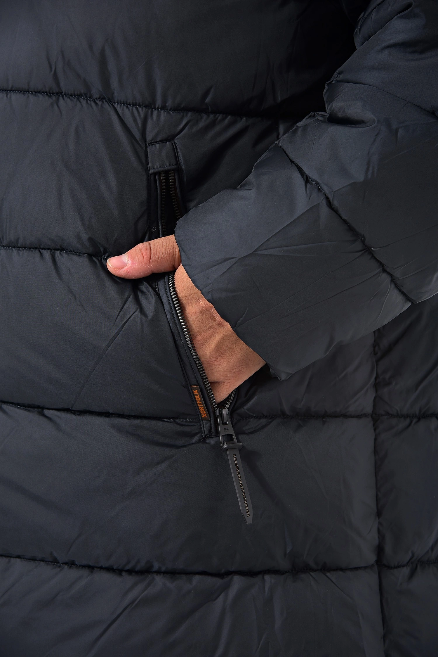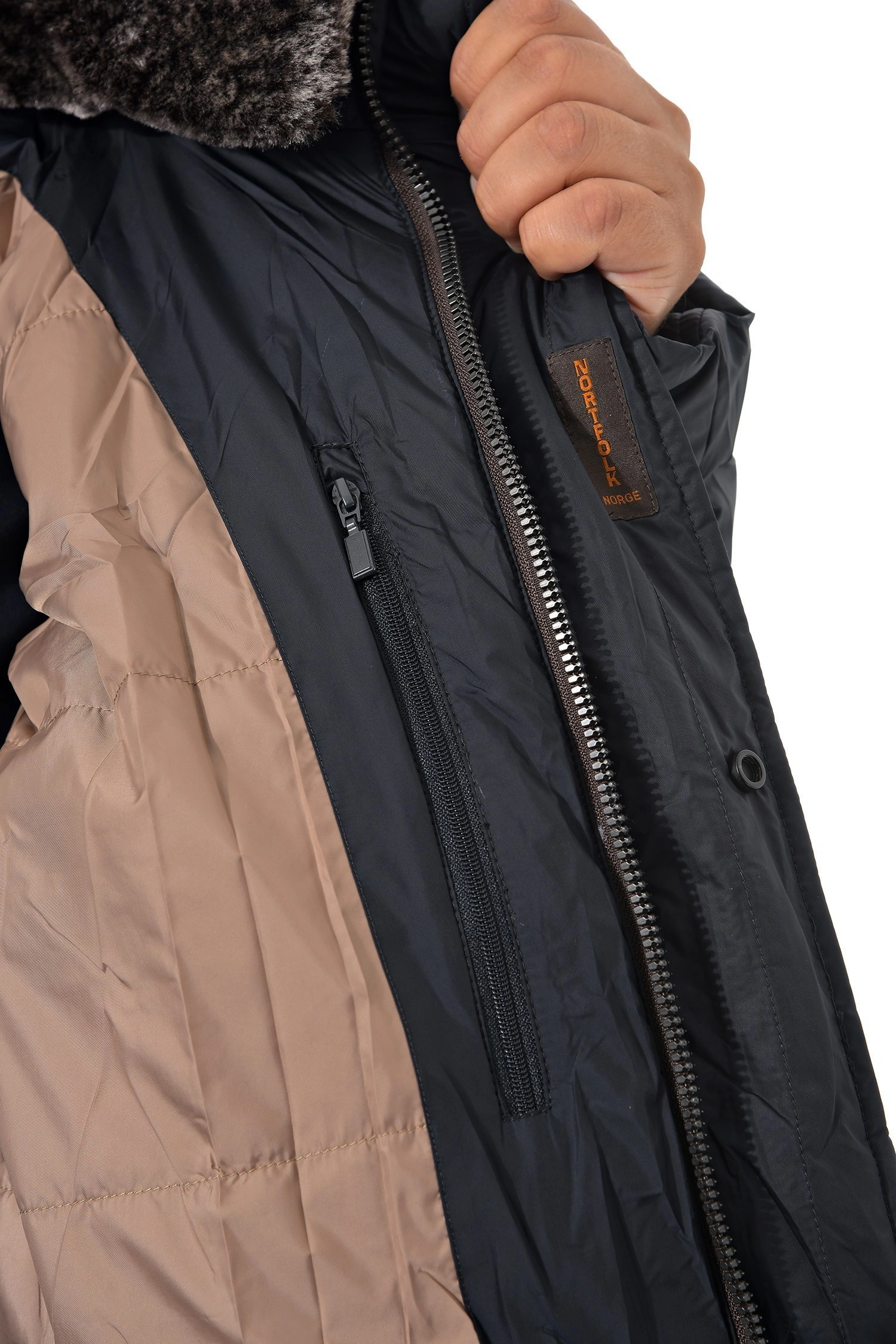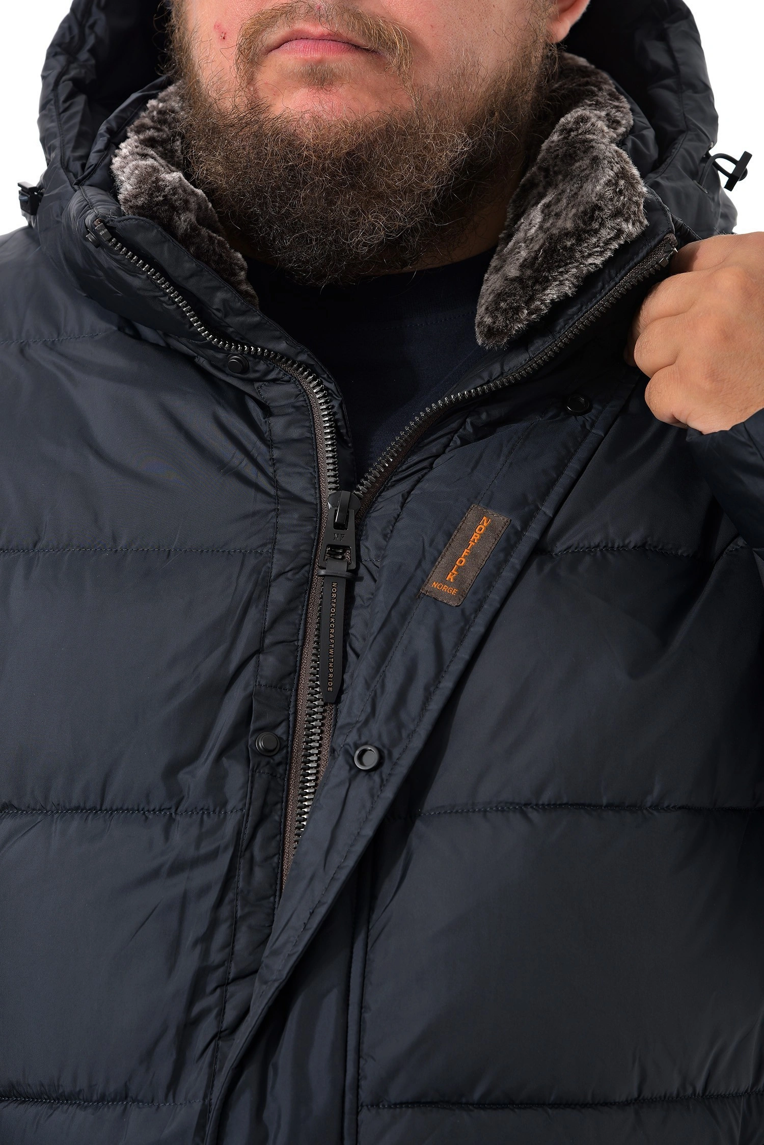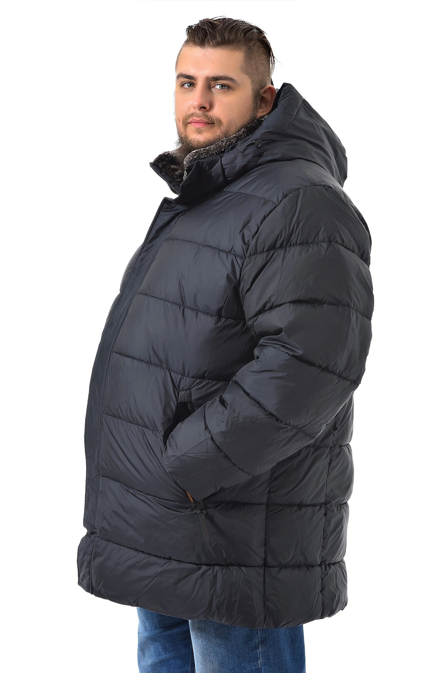 Зимняя удлиненная мужская куртка темно синего цвета с капюшоном. Утеплитель - синтепон. Хорошая посадка, качественная ткань и фурнитура. Множество функциональных карманов. Капюшон цельный