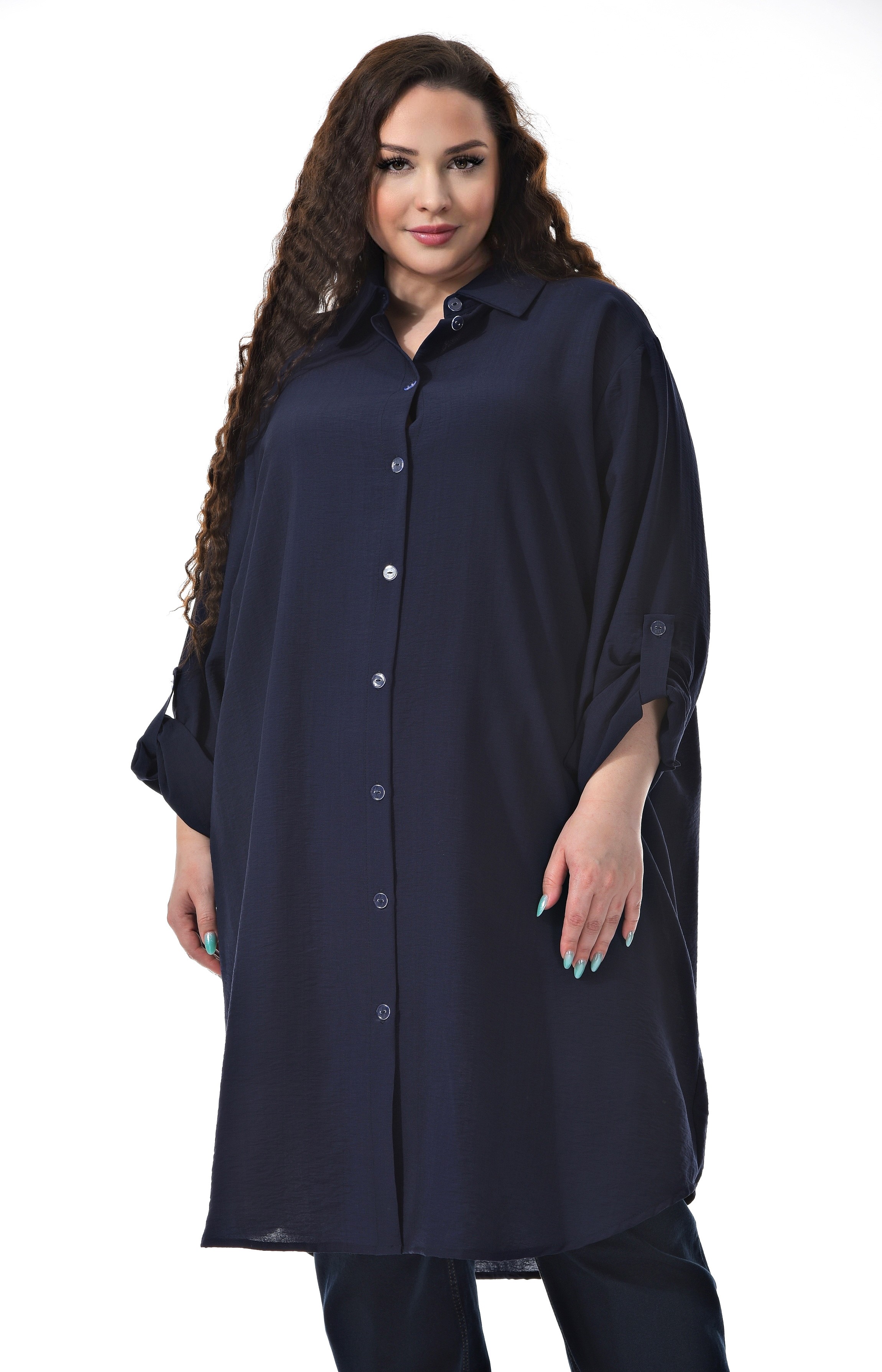 Удлиненная блузка-платье из шелковистого штапеля. Цвет синий. Рукав длинный с фиксацией на пуговичку на плече. Модель можно одеть с брюками, джинсами, лосинами, а можно носить как платье