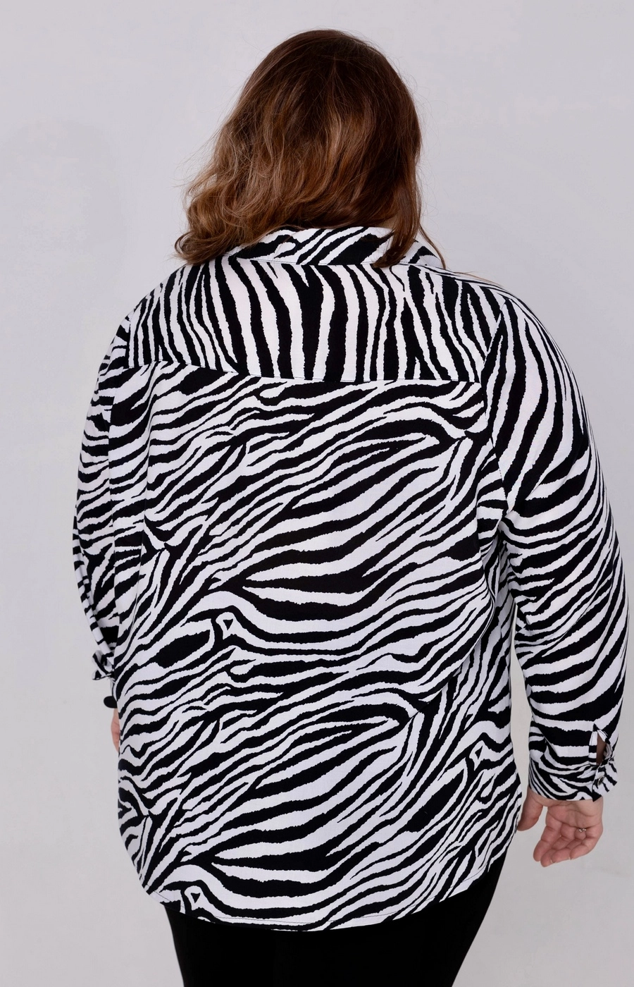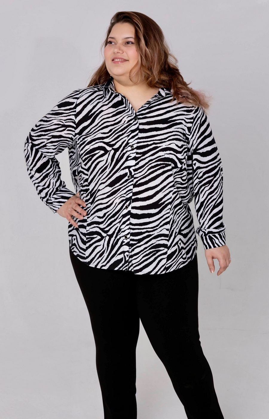 Хлопковая блузка в зебру, рубашка с длинным рукавом и классическим воротником, свободная блузка больших размеров идеально дополнит повседневный гардероб. Свободный прямой силуэт ниспадает до бедра, обеспечивая комфортную посадку без скованности движений. Длинные рукава с манжетами и центральная застежка на пуговицах по всей планке фиксируют модель аккуратно. Яркий принт зебры в черно-белой гамме покрывает всю поверхность рубашки, создавая выразительный контрастный узор. Гладкая текстура ткани подчеркивает динамику полос, делая блузку заметным акцентом. Круглый воротник и планка добавляют лаконичности силуэту. Носите дома за городом или на отдыхе с брюками леггинсами джинсами — образ всегда собранный. Поможем выбрать размер по вашим меркам. Организуем доставку вашим удобным способом. Закажите сейчас и обновите стиль без хлопот.