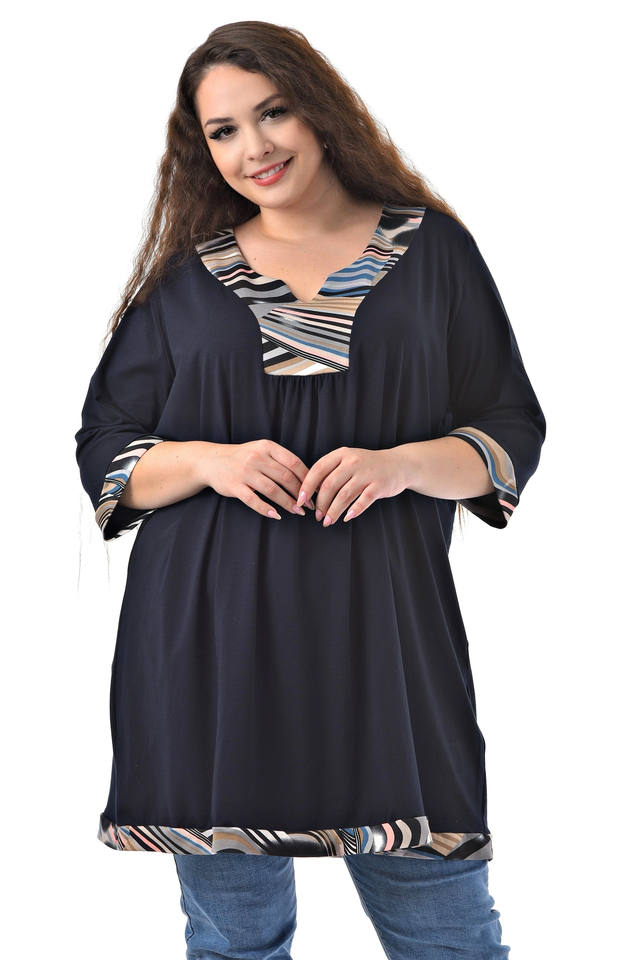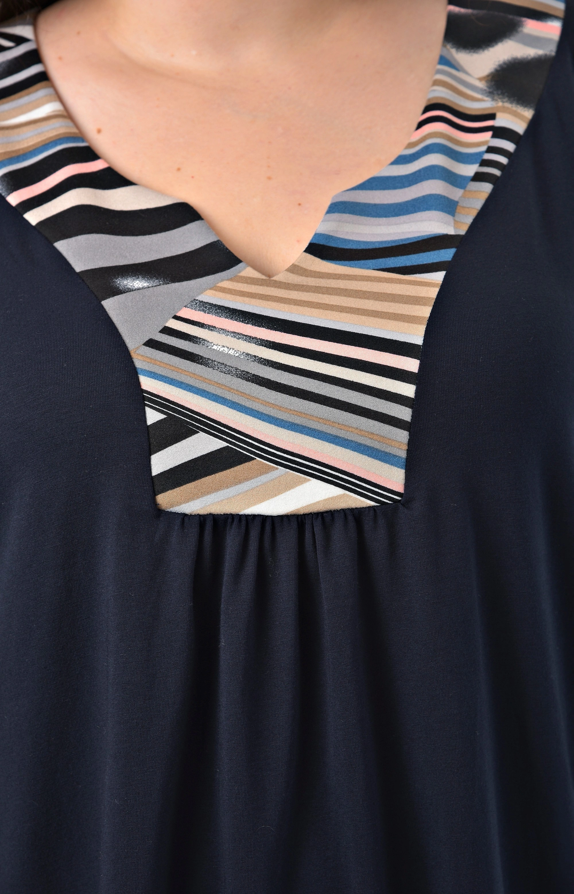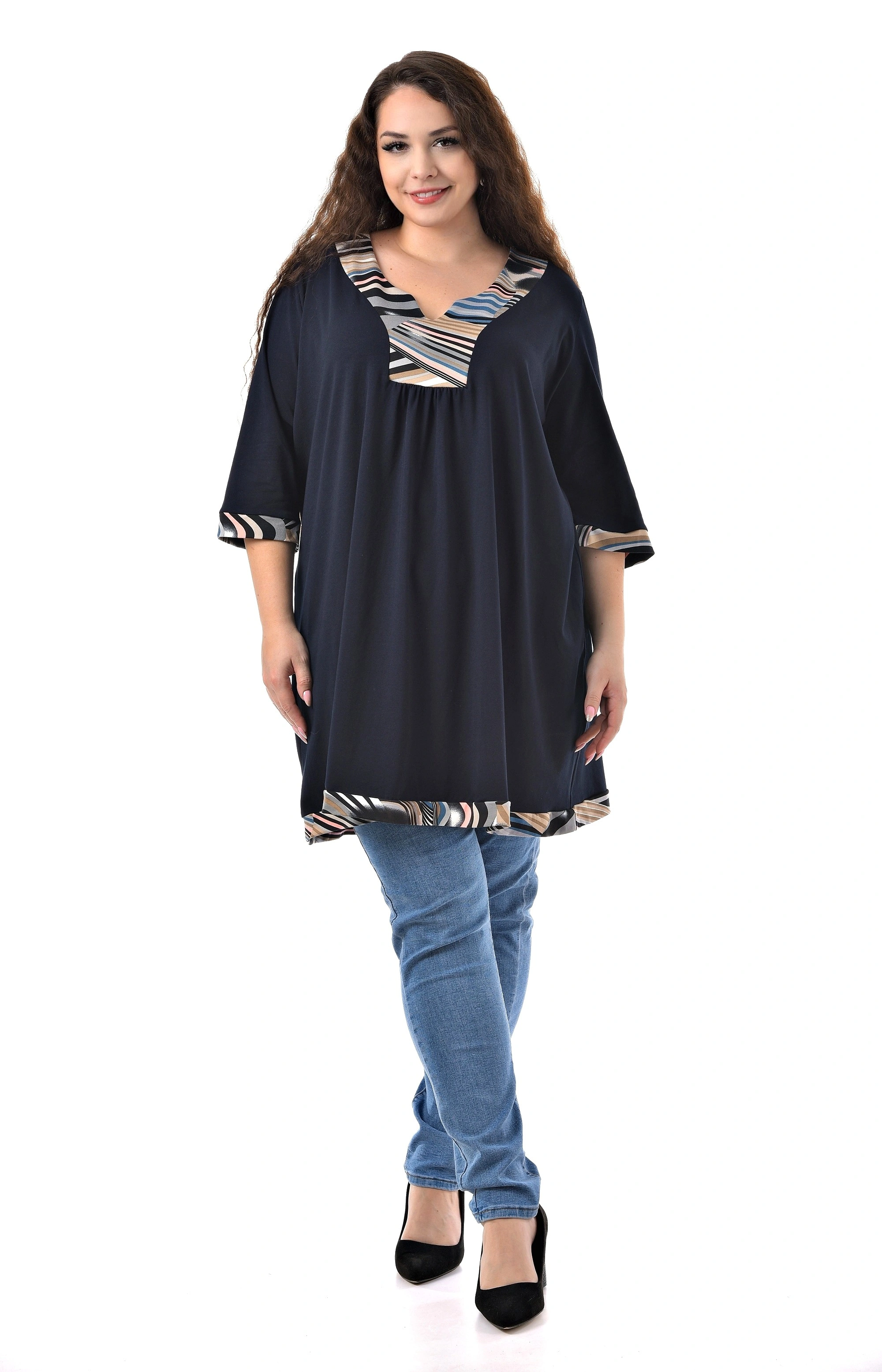 Женская туника с красиво оформленным вырезом. Сине-белая гамма. Силуэт трапеция