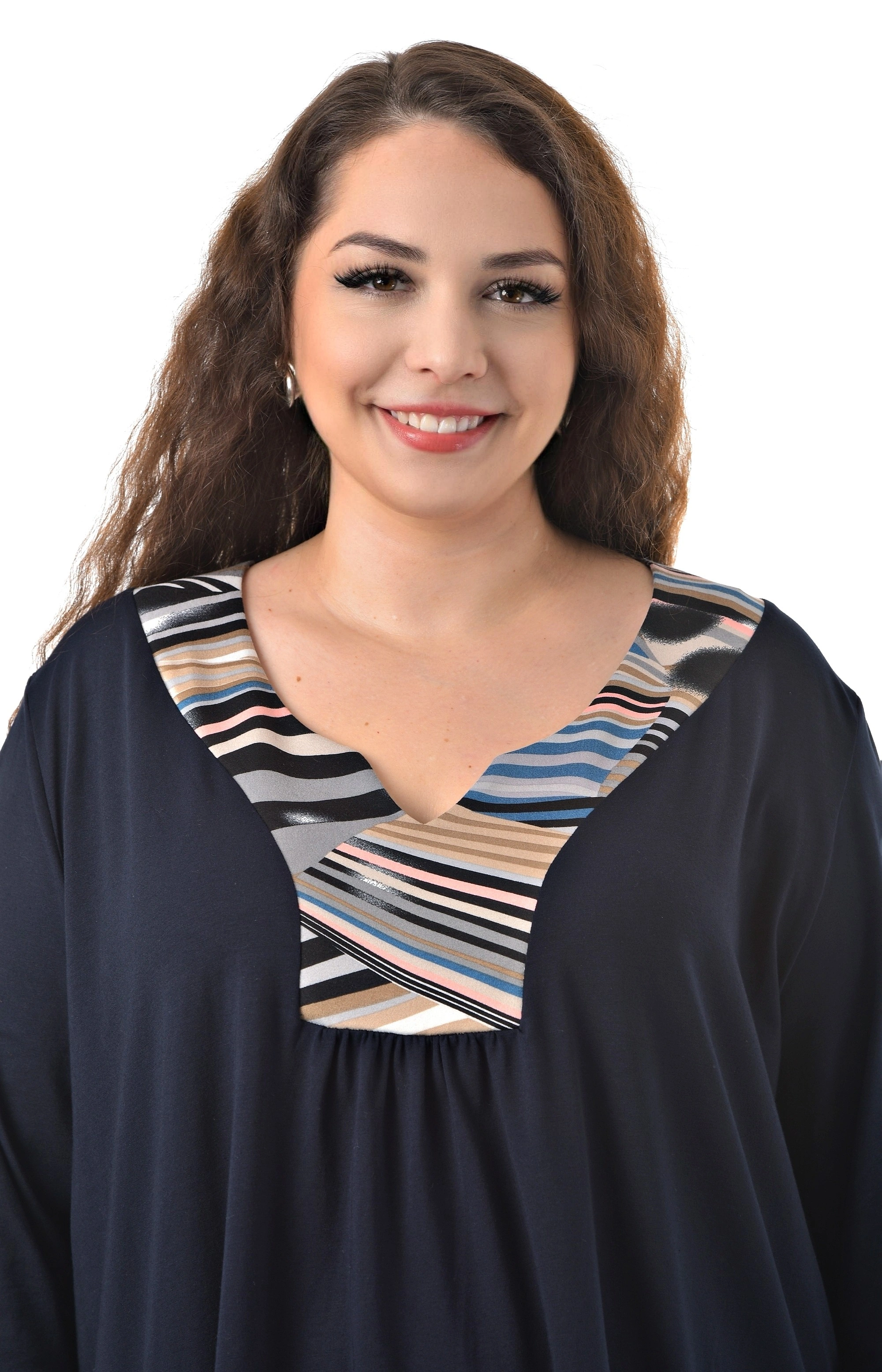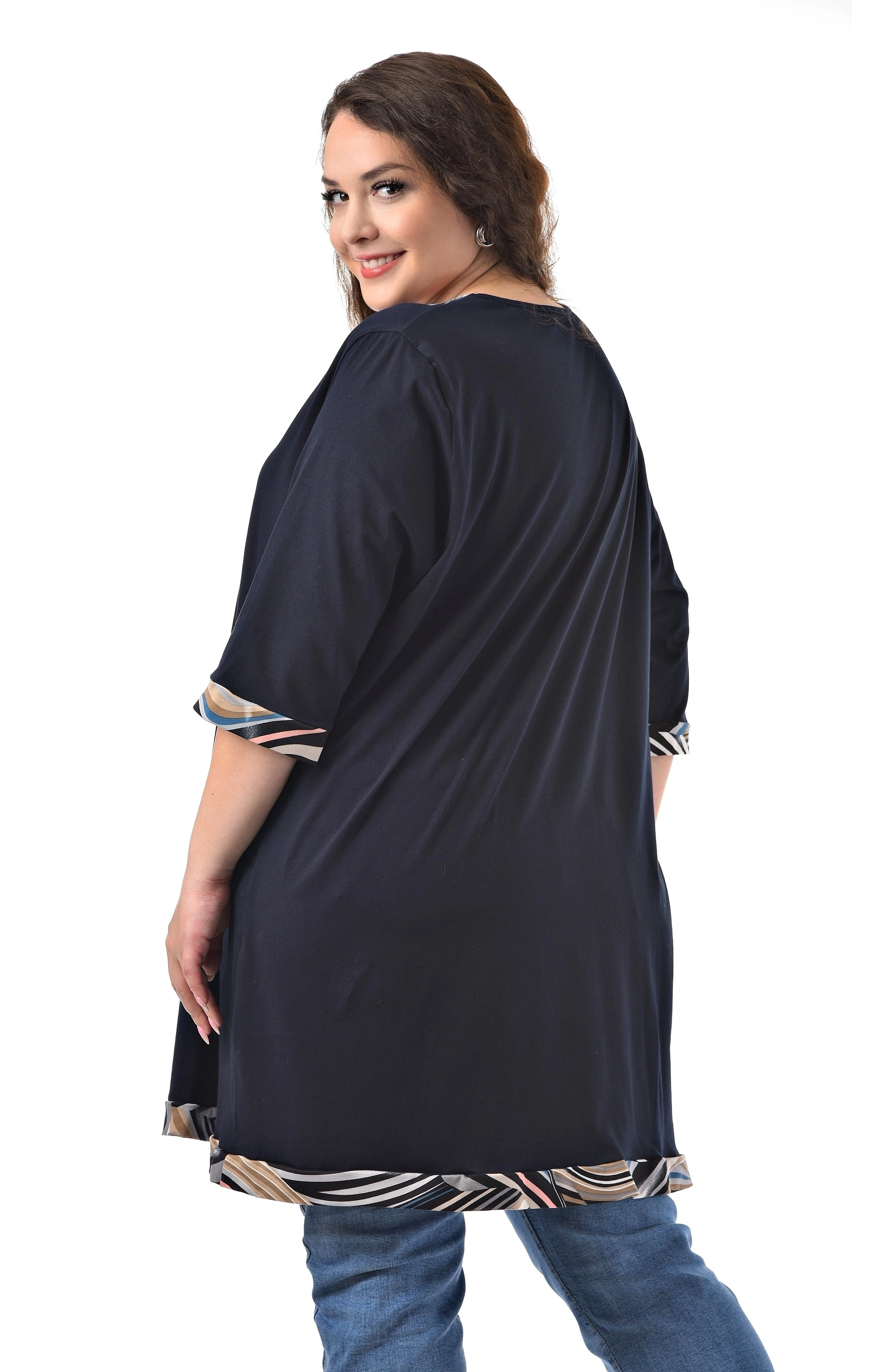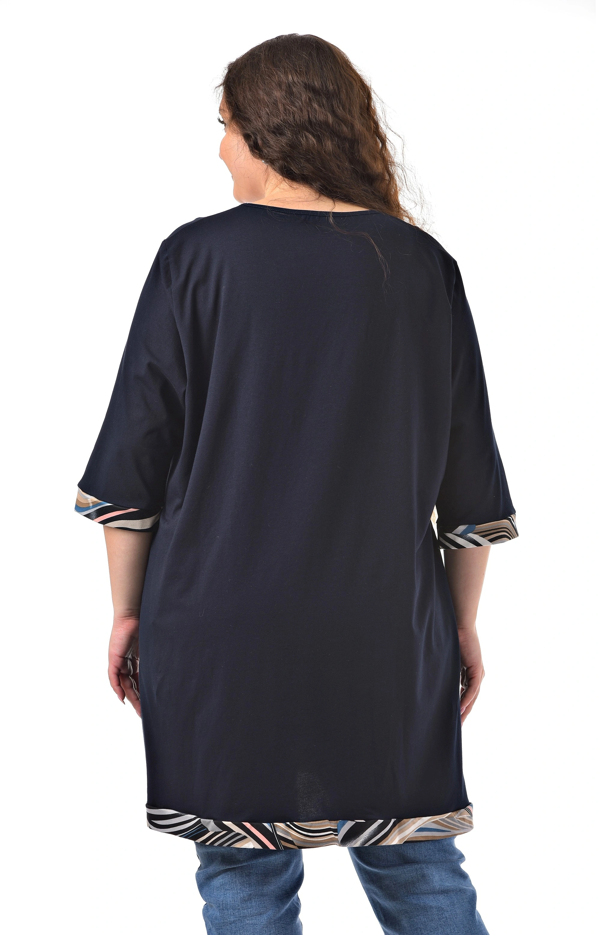 Женская туника с красиво оформленным вырезом. Сине-белая гамма. Силуэт трапеция