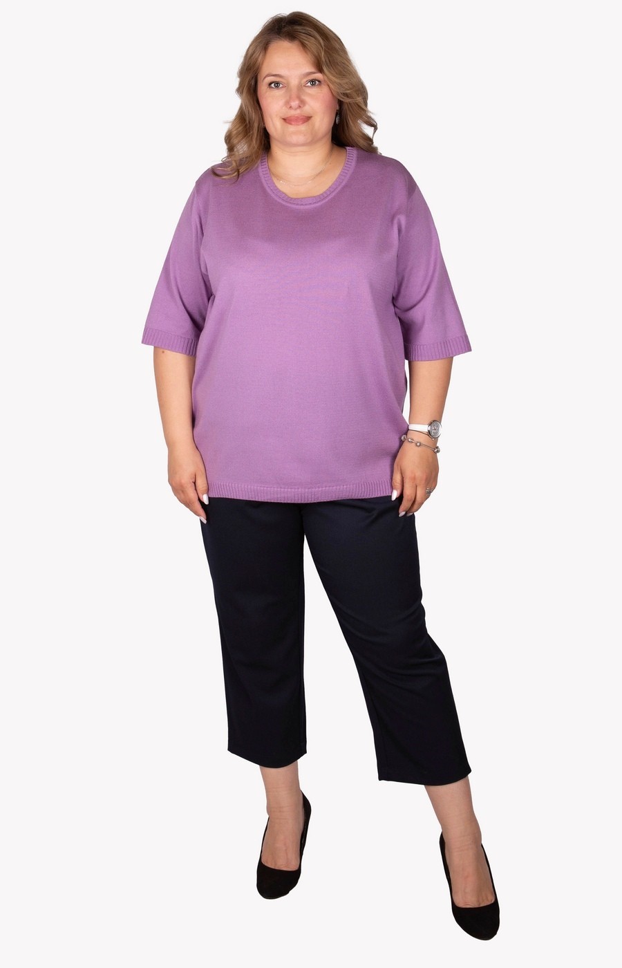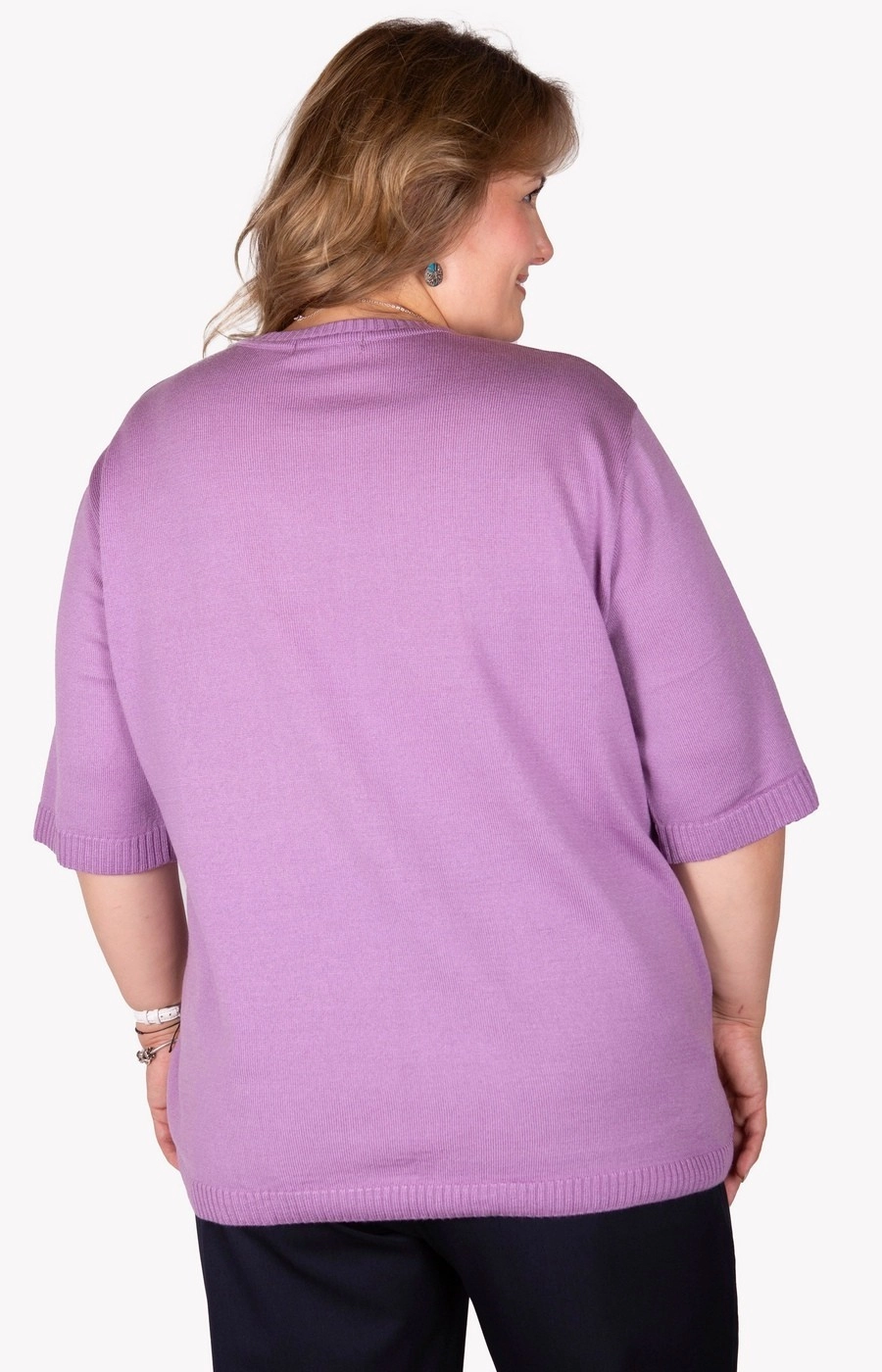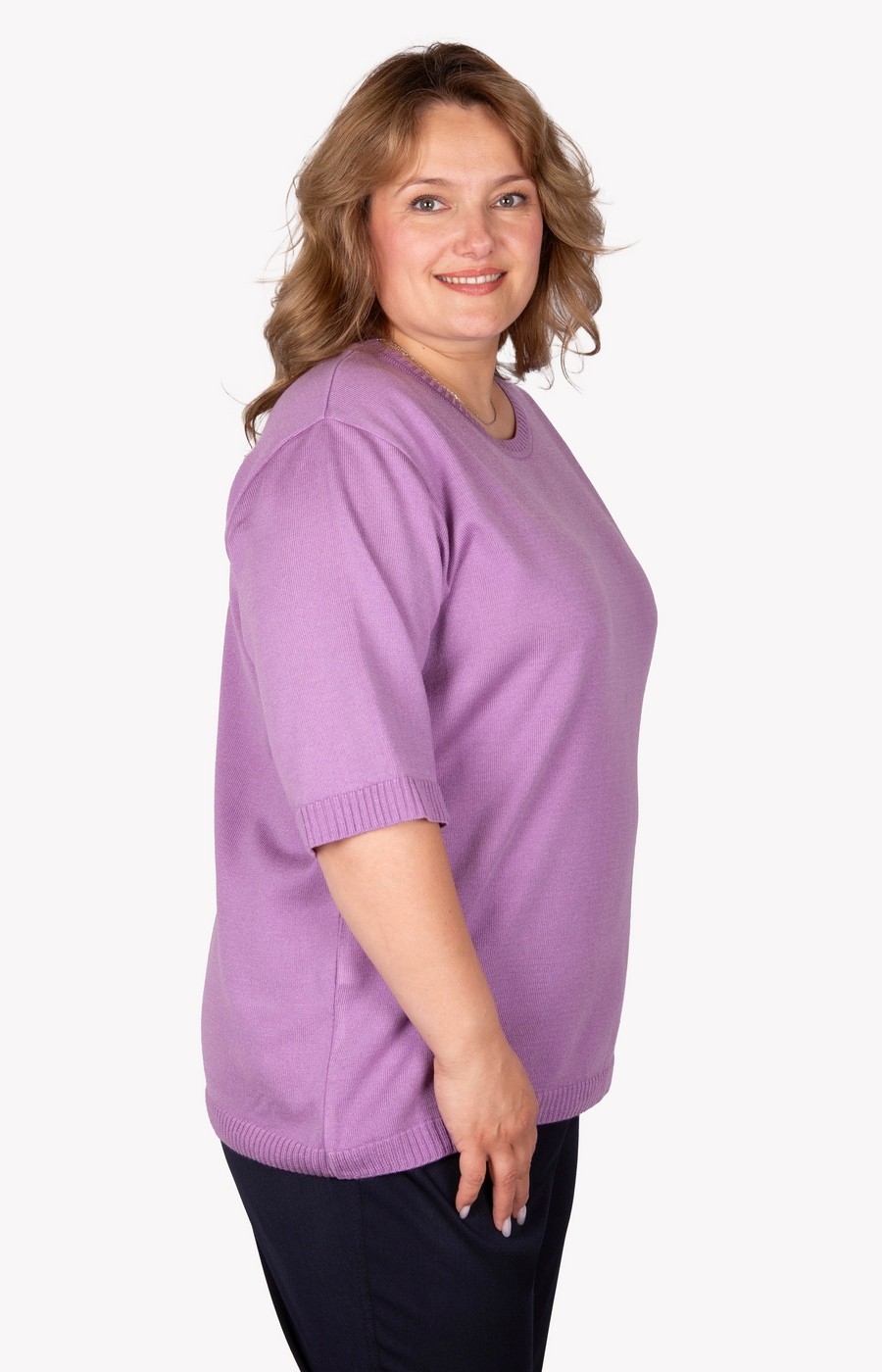 Женский трикотажный джемпер лавандового цвета. Вырез круглый. Рукав три четверти