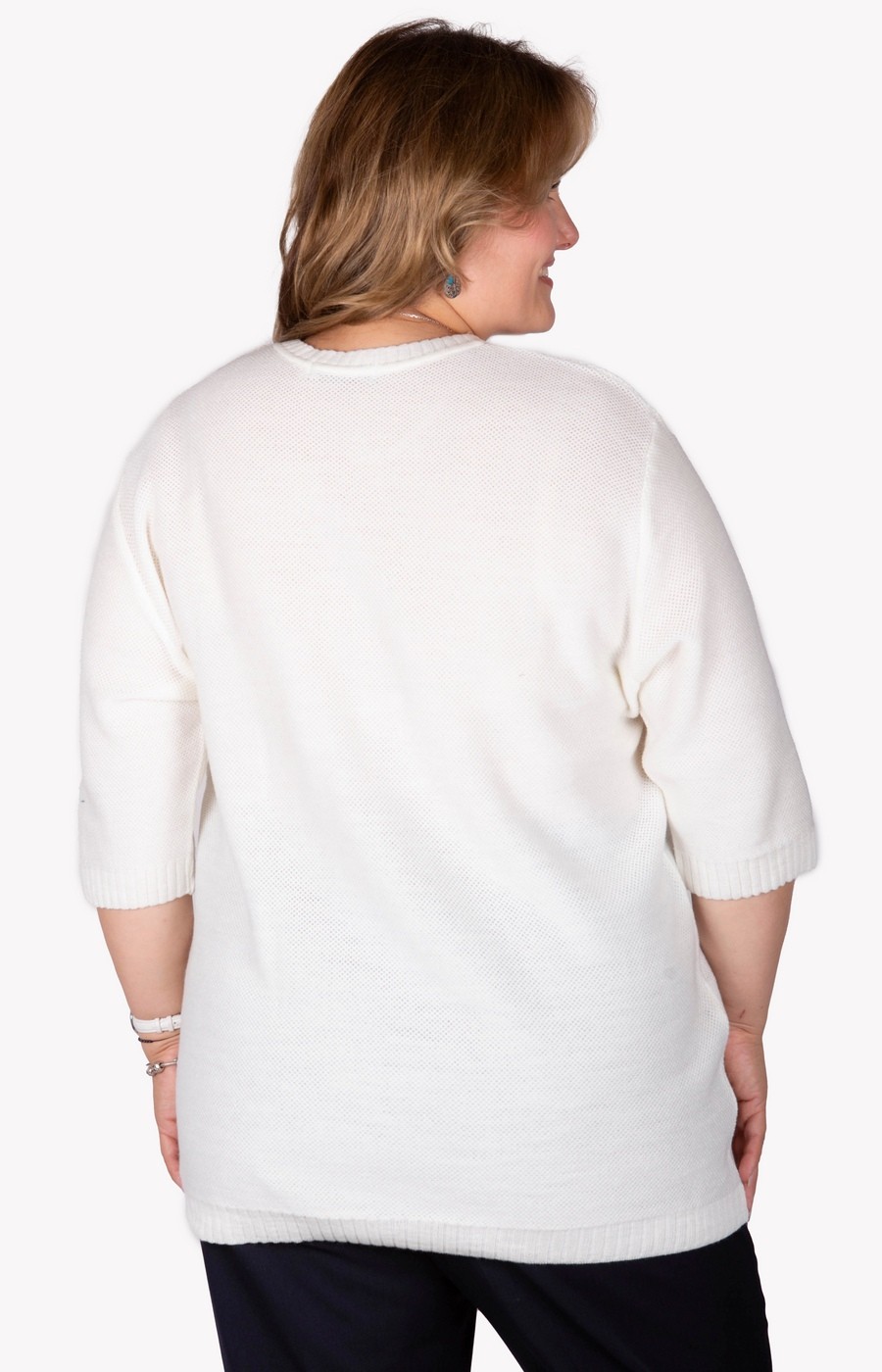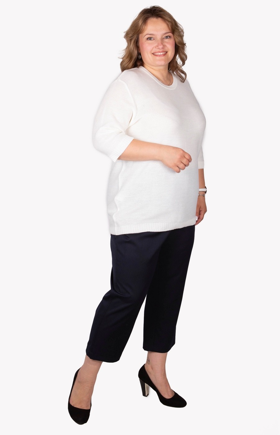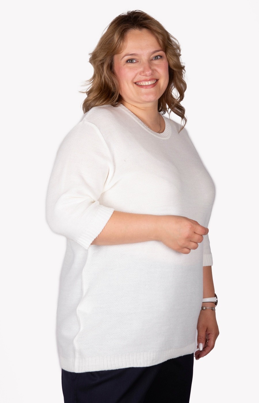 Женский трикотажный джемпер молочно белого цвета. Вырез круглый. Рукав три четверти
