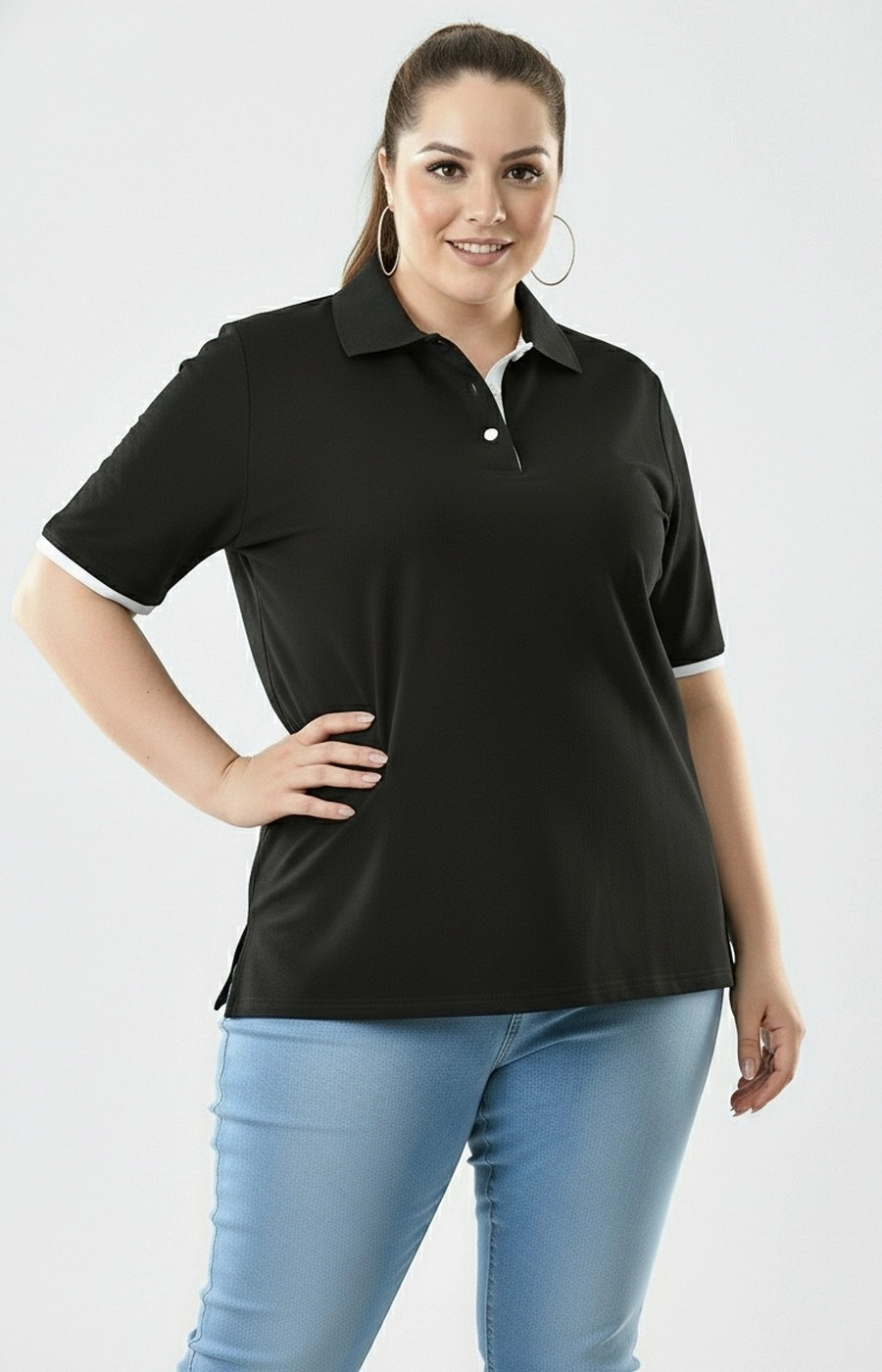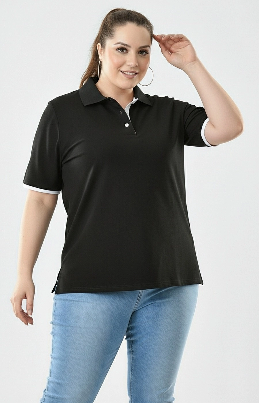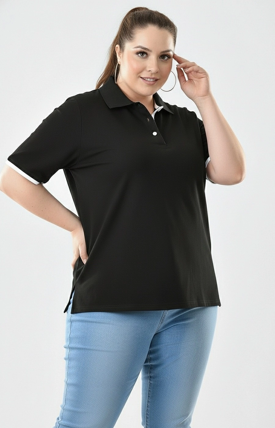 Женская футболка поло черного цвета в свободном прямом силуэте создает аккуратный повседневный образ и комфортна на каждый день. Контрастный отложной воротник-поло с короткой планкой на пуговицах формирует выразительную линию горловины, а светлая внутренняя стойка и отделка рукавов добавляют лаконичный акцент. Короткие рукава с контрастным кантом выглядят аккуратно и уместны как для дома, так и для прогулок или неформальной рабочей обстановки. Длина по линии бедра и небольшие разрезы по бокам обеспечивают комфорт при движении и позволяют легко сочетать футболку с джинсами или повседневными брюками. Если сомневаетесь с выбором, мы поможем подобрать размер и удобную посадку по вашим параметрам и организуем доставку удобным для вас способом, чтобы примерка прошла без лишних хлопот.