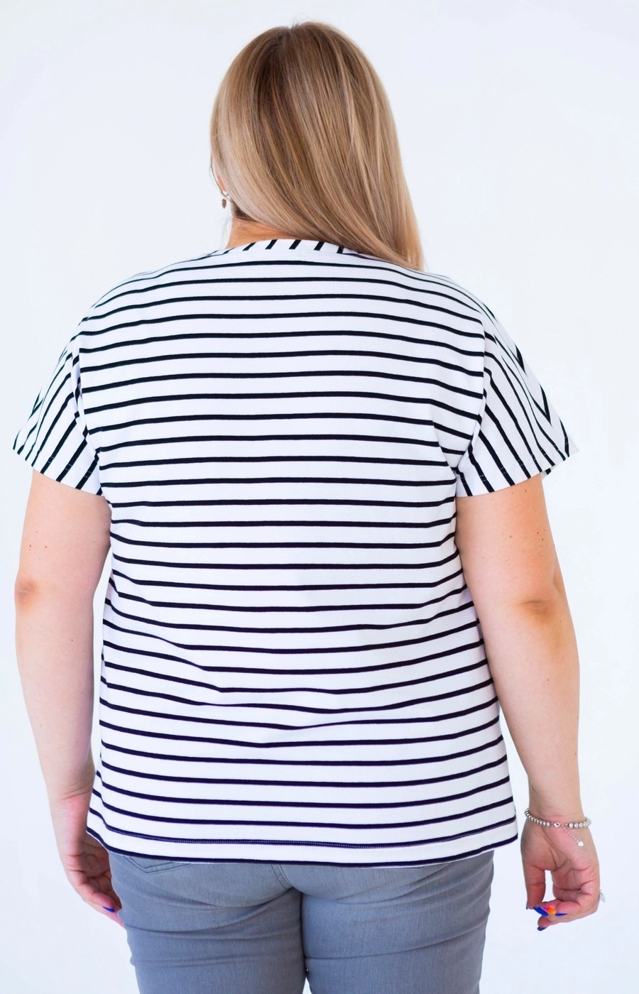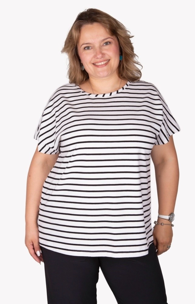 Эта женская футболка в полоску послужит универсальной базой для создания собранных повседневных образов. Лаконичная модель прямого кроя отличается свободной посадкой, которая обеспечивает комфорт и аккуратный силуэт. Изделие дополнено округлым вырезом горловины с узкой бейкой в тон и короткими цельнокроеными рукавами, формирующими плавную и мягкую линию плеча. Гладкая фактура ткани ровно ложится по фигуре, а длина до середины бедра позволяет носить вещь как навыпуск, так и заправленной в пояс. Контрастный черно-белый принт легко сочетается с однотонными брюками или денимом в комплектах для прогулок, работы и домашнего отдыха. Мы с радостью поможем сверить ваши параметры с размерной сеткой для идеальной посадки. Бережно упакуем и отправим заказ удобным для вас способом доставки.