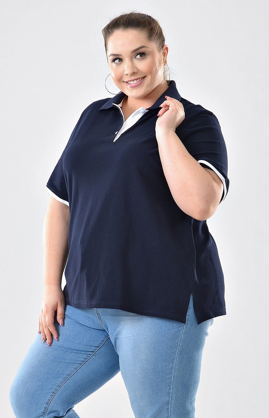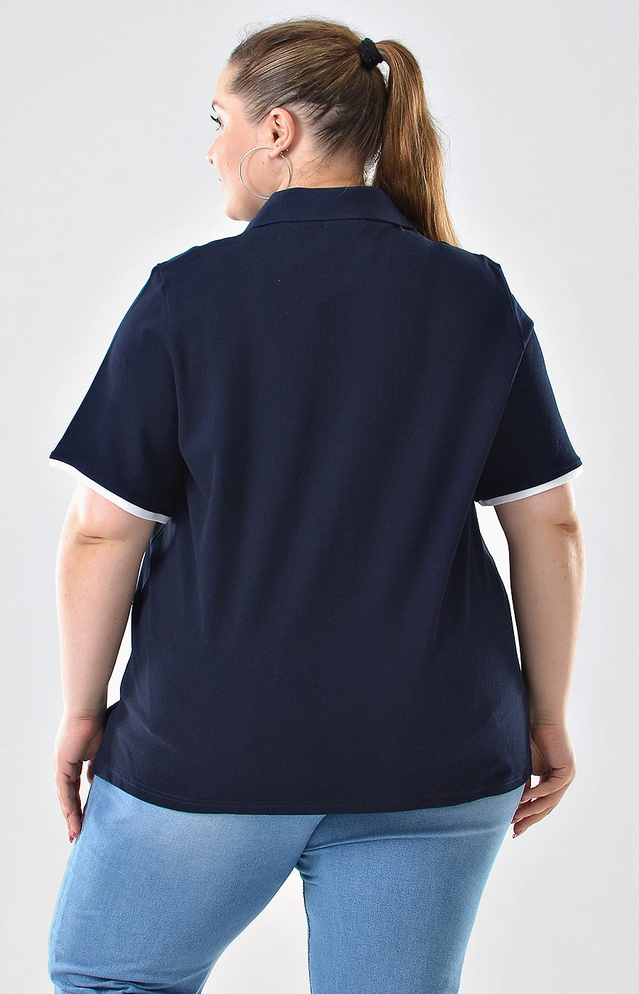 Женская тенниска из 100% хлопка темно-синего цвета. Отделка белым по планке и рукавам.