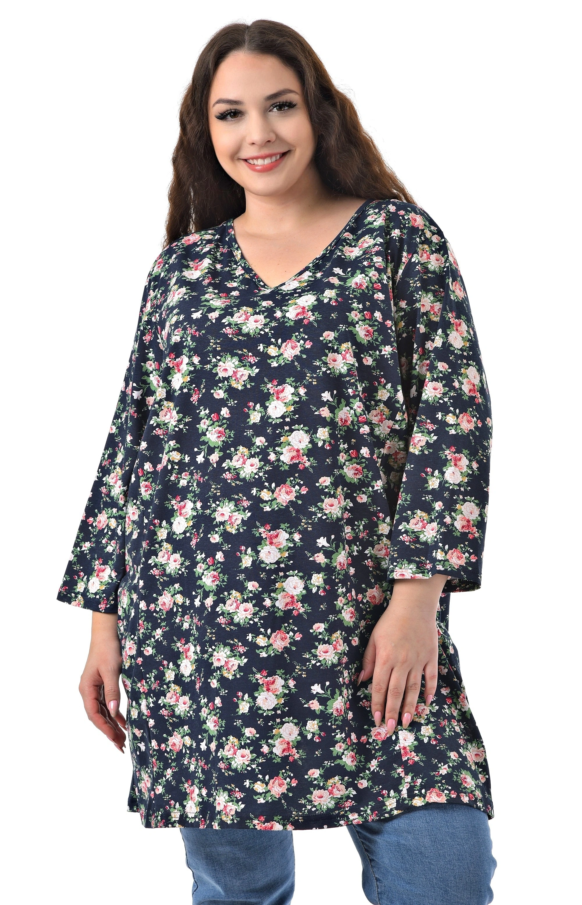 Стильная туника от бренда "Большие люди" с цветочным рисунком на синем фоне добавляет образу женственности. Универсальная удлинённая модель изготовлена из 100% хлопковой ткани. Модель с V вырезом горловины. Рукав втачной 3/4 гармонично впишется в любой стиль. Данную модель можно носить в любой сезон. Она отлично сочетается с любыми брюками и джинсами, поэтому скомбинировать образ не составит труда. Стильная, удобная, повседневная туника займёт достойное место в Вашем гардеробе.