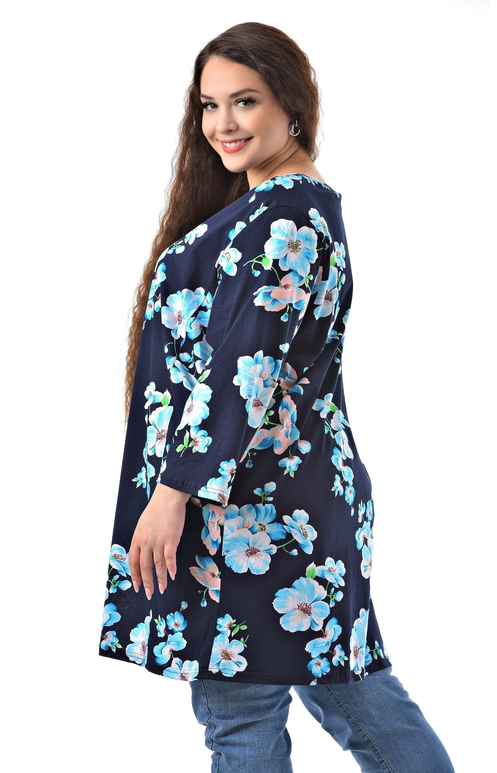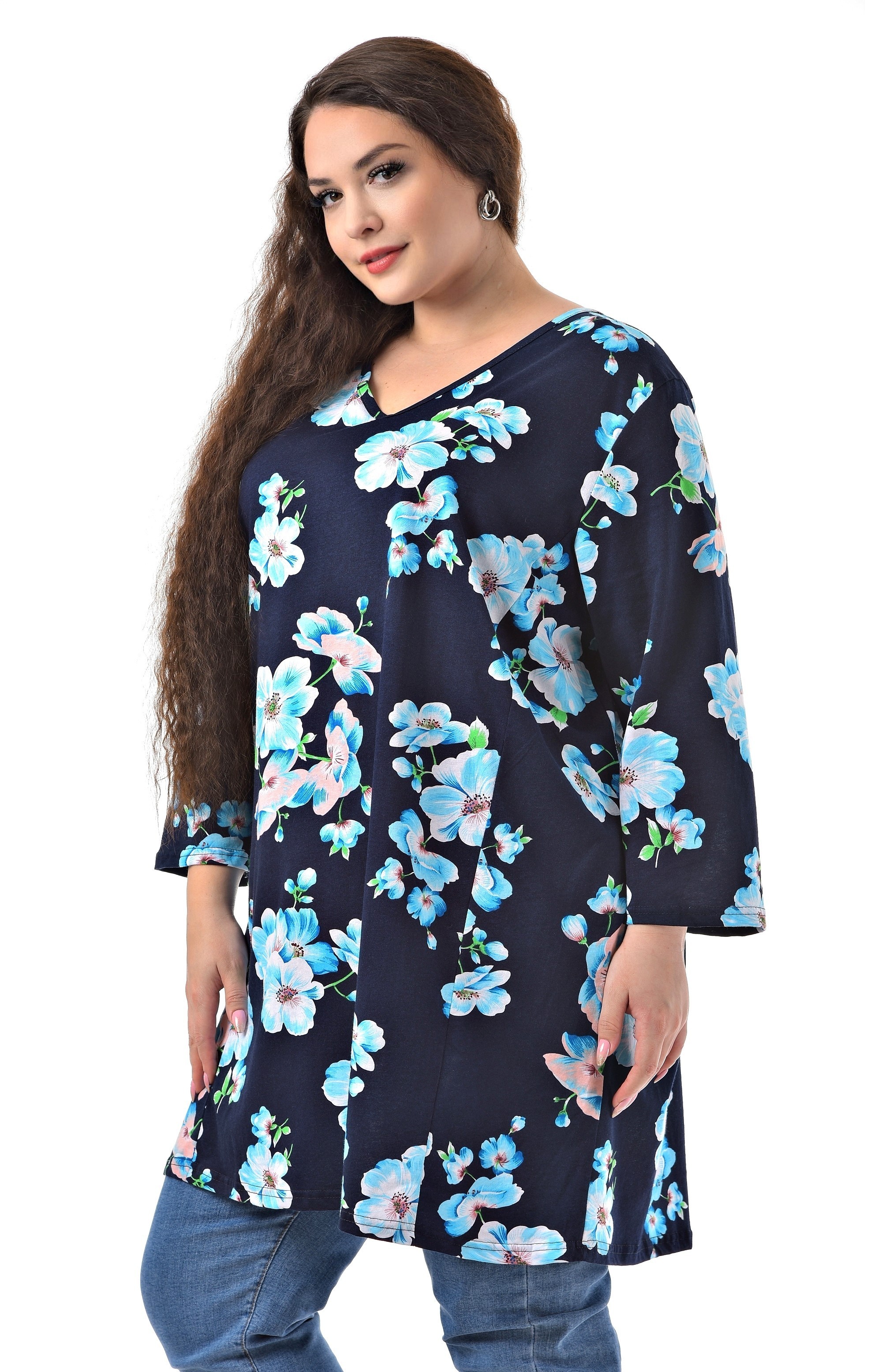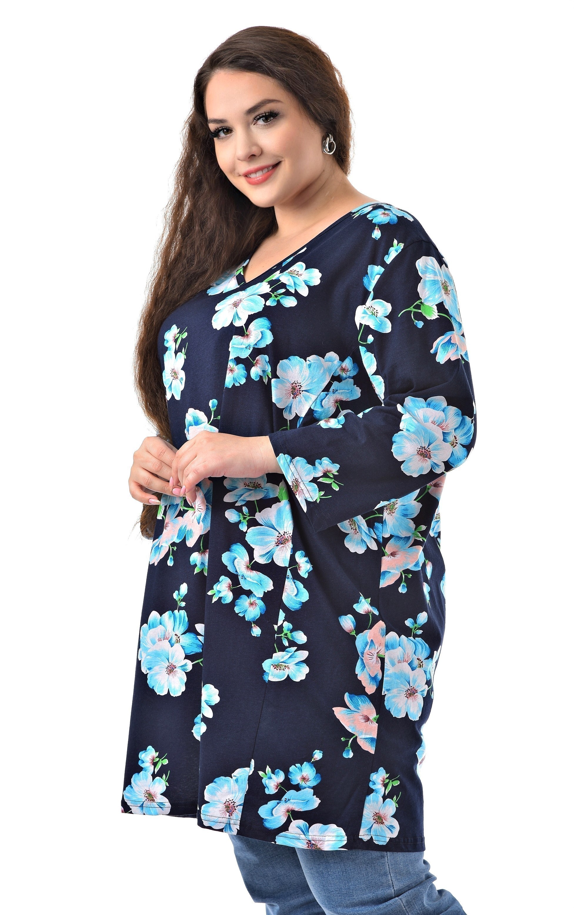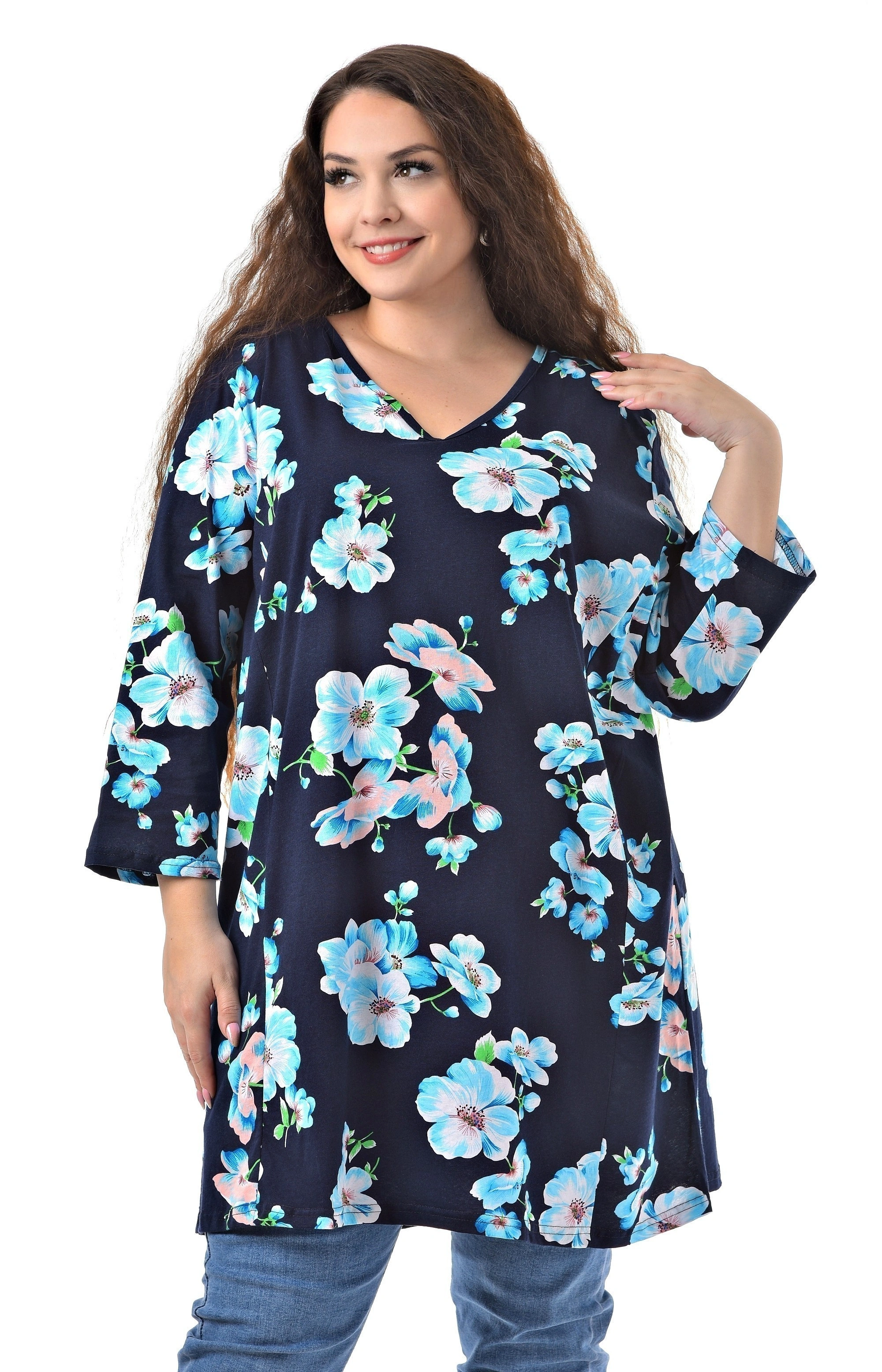 Стильная туника от бренда "Большие люди" с цветочным рисунком на синем фоне добавляет образу женственности. Универсальная удлинённая модель изготовлена из 100% хлопковой ткани. Модель с V вырезом горловины. Рукав втачной 3/4 гармонично впишется в любой стиль. Данную модель можно носить в любой сезон. Она отлично сочетается с любыми брюками и джинсами, поэтому скомбинировать образ не составит труда. Стильная, удобная, повседневная туника займёт достойное место в Вашем гардеробе.