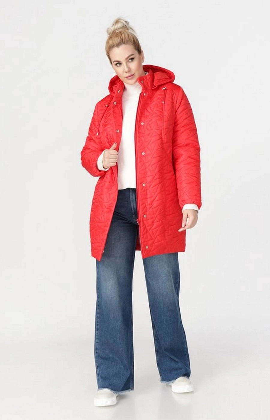 Демисезонная стеганая удлинённая куртка красного цвета. Производство Россия. Модель имеет съёмный капюшон, два врезных кармана. Молния по всей длине с планкой от ветра на потайных кнопках. Это идеальный вариант для повседневной носки веной, осенью или зимой. Изделие выполнено из ветрозащитной и влагозащитной ткани. Комфортная модель, в которой Вы будете себя чувствовать удобно и стильно.