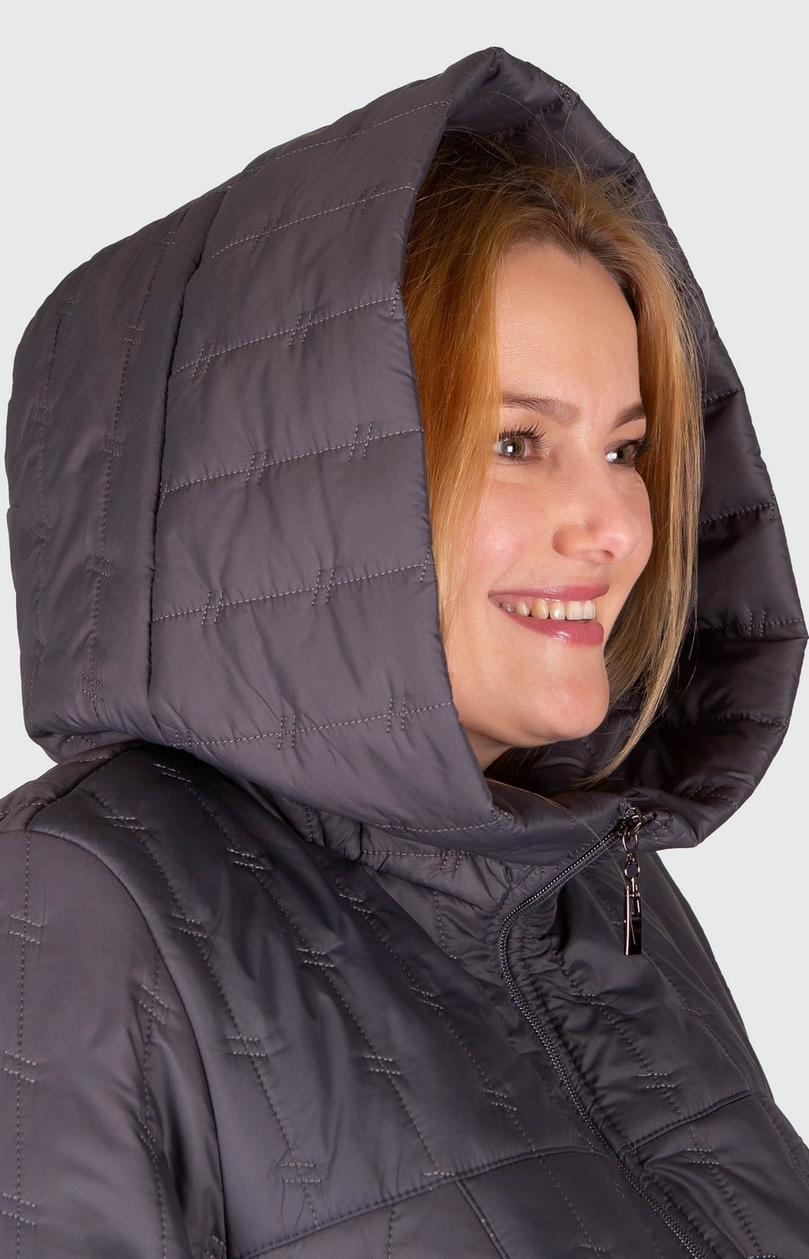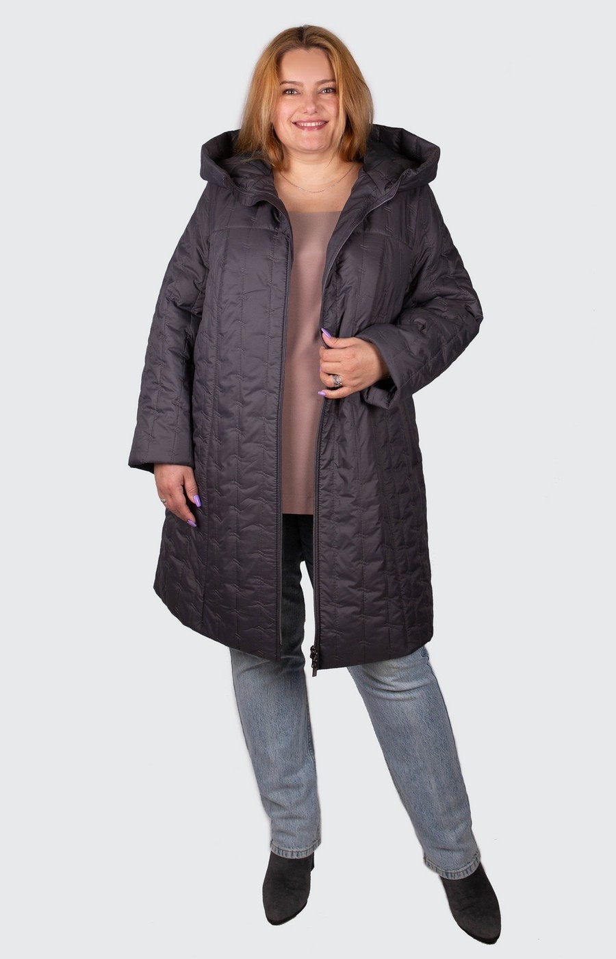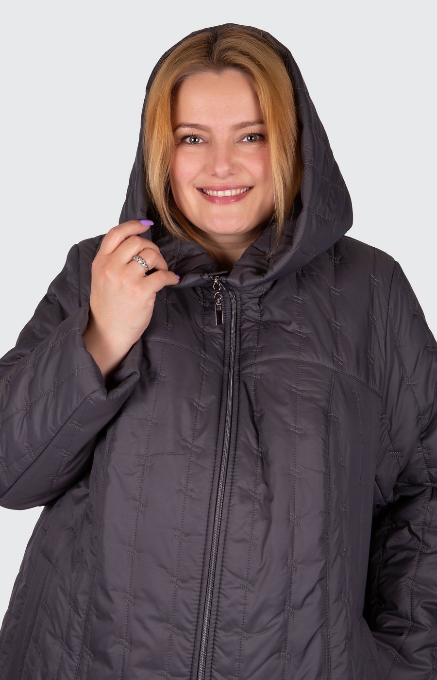 Полупальто женское стеганое в цвете графит. Центральная застежка на молнию. Цельный капюшон.