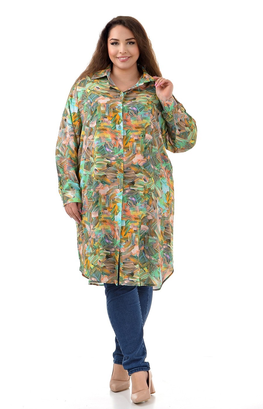 Универсальный прямой крой: свободная талия не сковывает движений, вырез горловины оформлен отложным воротником на стойке, по всей длине блузки расположена планка с застежкой на пуговицы, втачной рукав с манжетами на пуговицу регулируется при помощи специальной петли. Размеры 04XL-08XL (обхват талии, груди и бедер 154-174 см) для широкого диапазона фигур. Стильная блуза-рубашка легко комбинируется с брюками, леггинсами, джинсами или носится как платье. Российское производство "Большие люди" — универсальная вискозная туника-рубашка с принтом для женщин больших размеров.