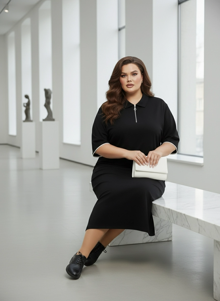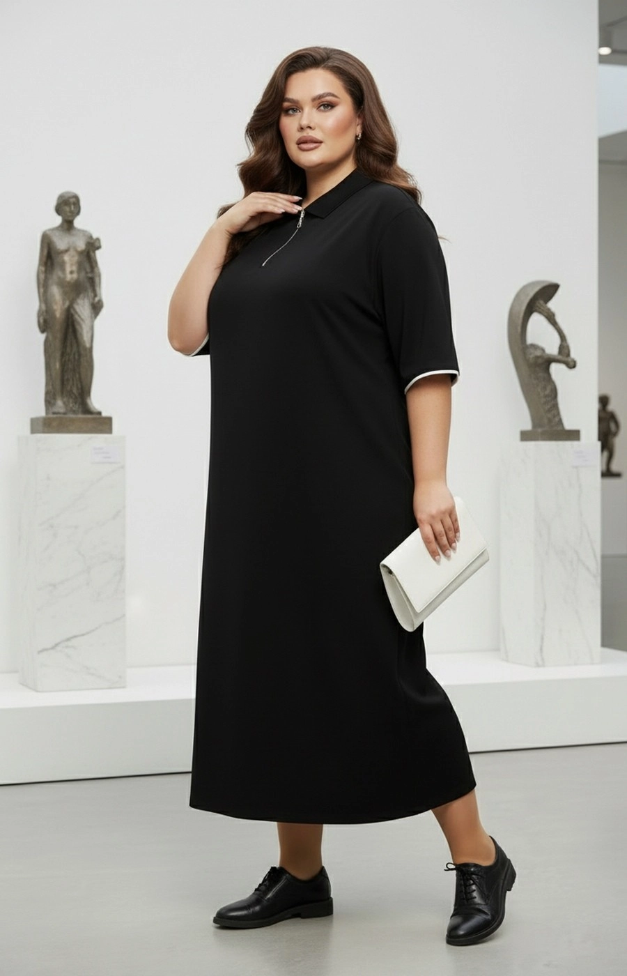 Женское черное платье — лаконичное платье миди из ткани лакоста "пике". Платье с воротником на молнии формирует аккуратную вертикальную линию у горловины и позволяет менять степень открытости. Силуэт прямой и свободный, без акцентированной талии, длина по кадру ниже колена. Удлиненный короткий рукав оформлен контрастной белой окантовкой по краю, что добавляет графичность минималистичному дизайну. Модель подходит для города, поездок и спокойных повседневных выходов — достаточно добавить кеды или лоферы. Подскажем размер и посадку по вашим параметрам. Напишите нам — поможем с выбором размера и организуем доставку удобным способом.