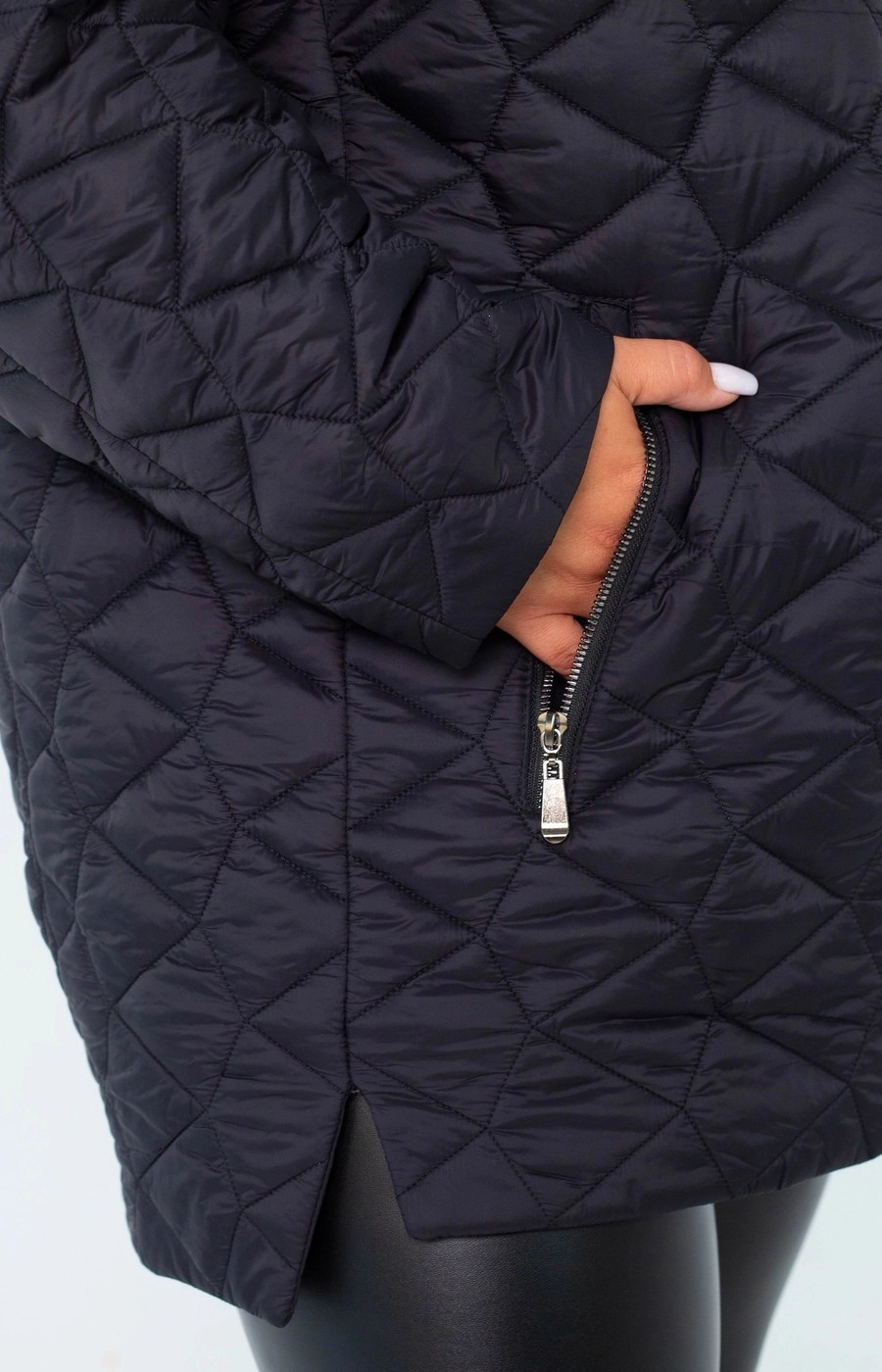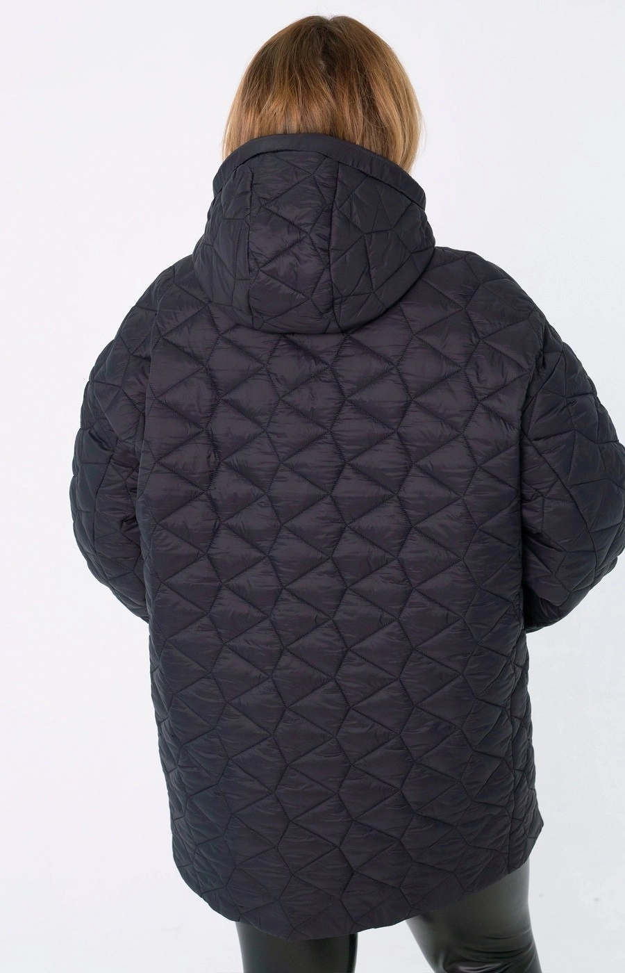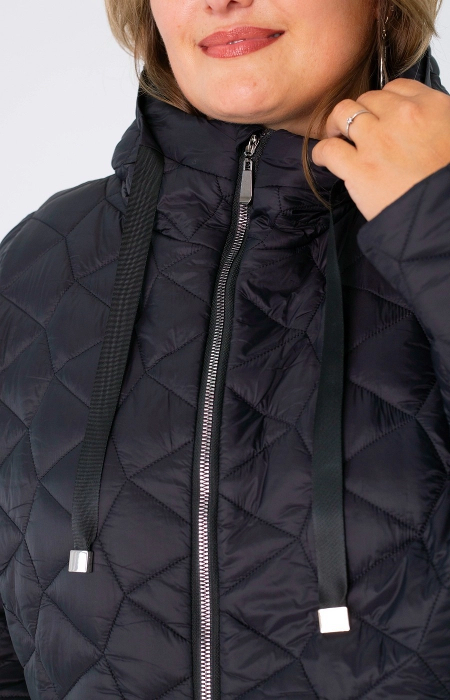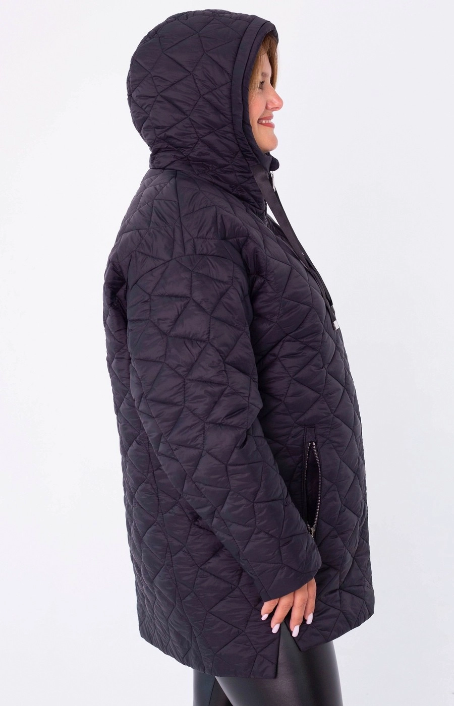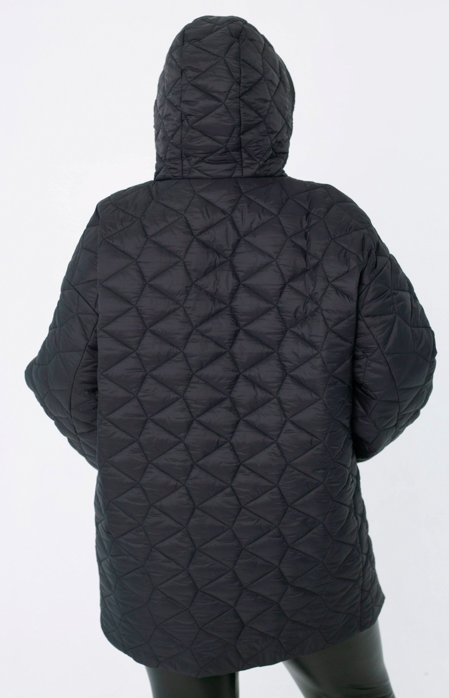 Женская стеганая куртка с застежкой на центральную молнию. Цельный капюшон. Цвет черный