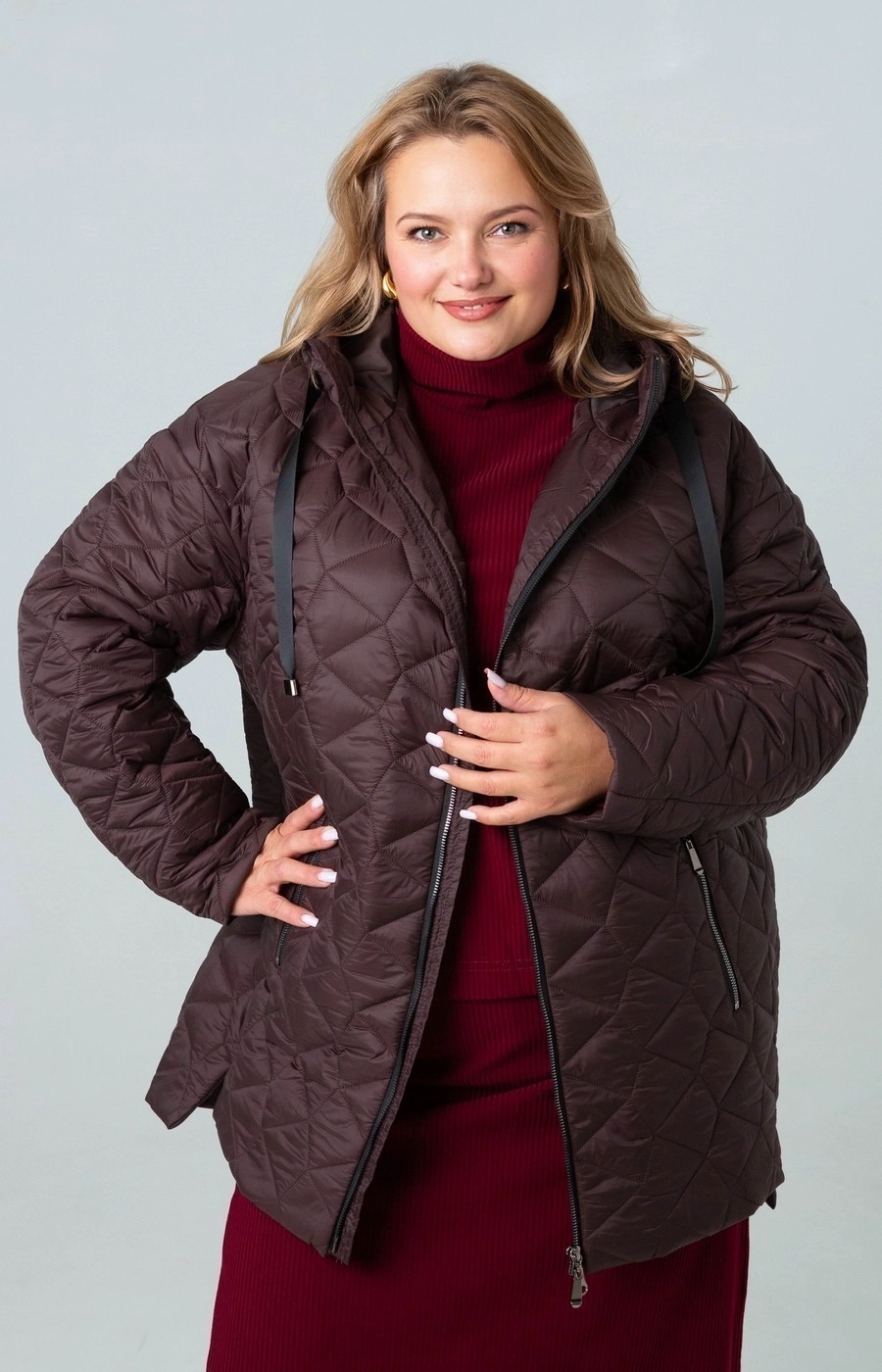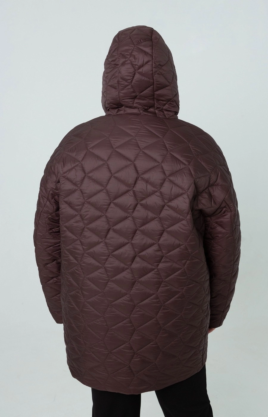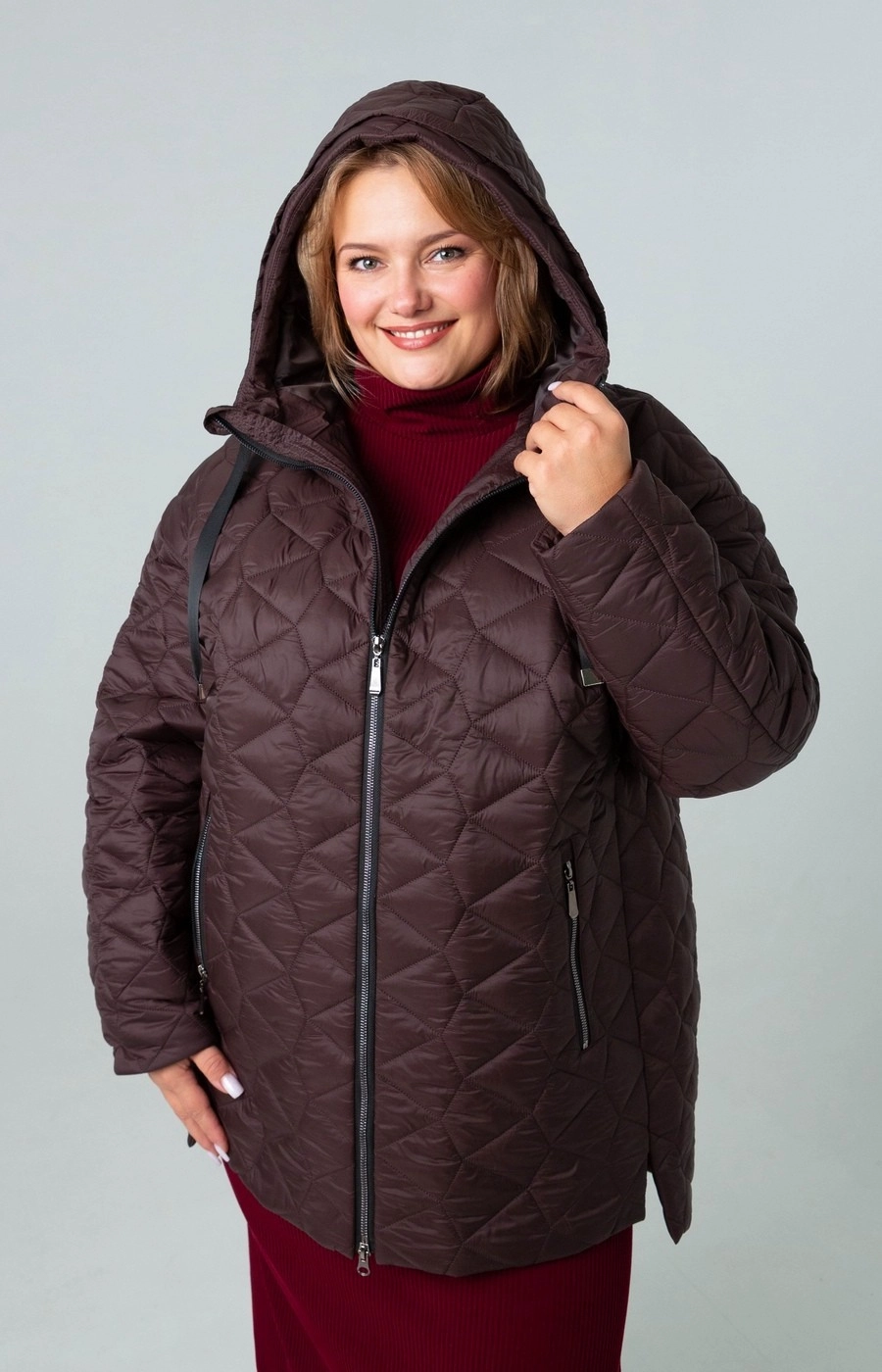 Женская стеганая куртка с застежкой на центральную молнию. Цельный капюшон. Цвет шоколадно-коричневый