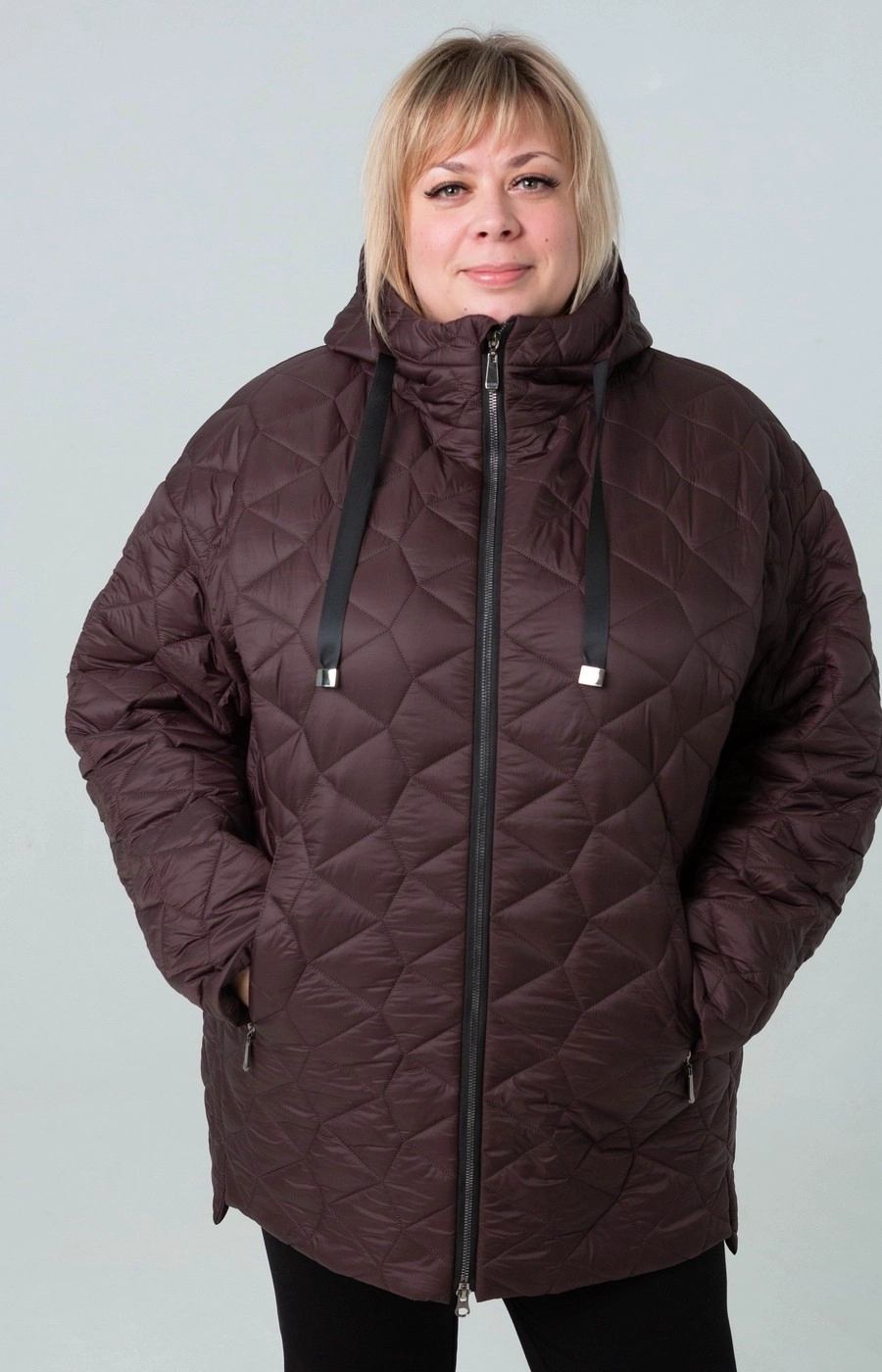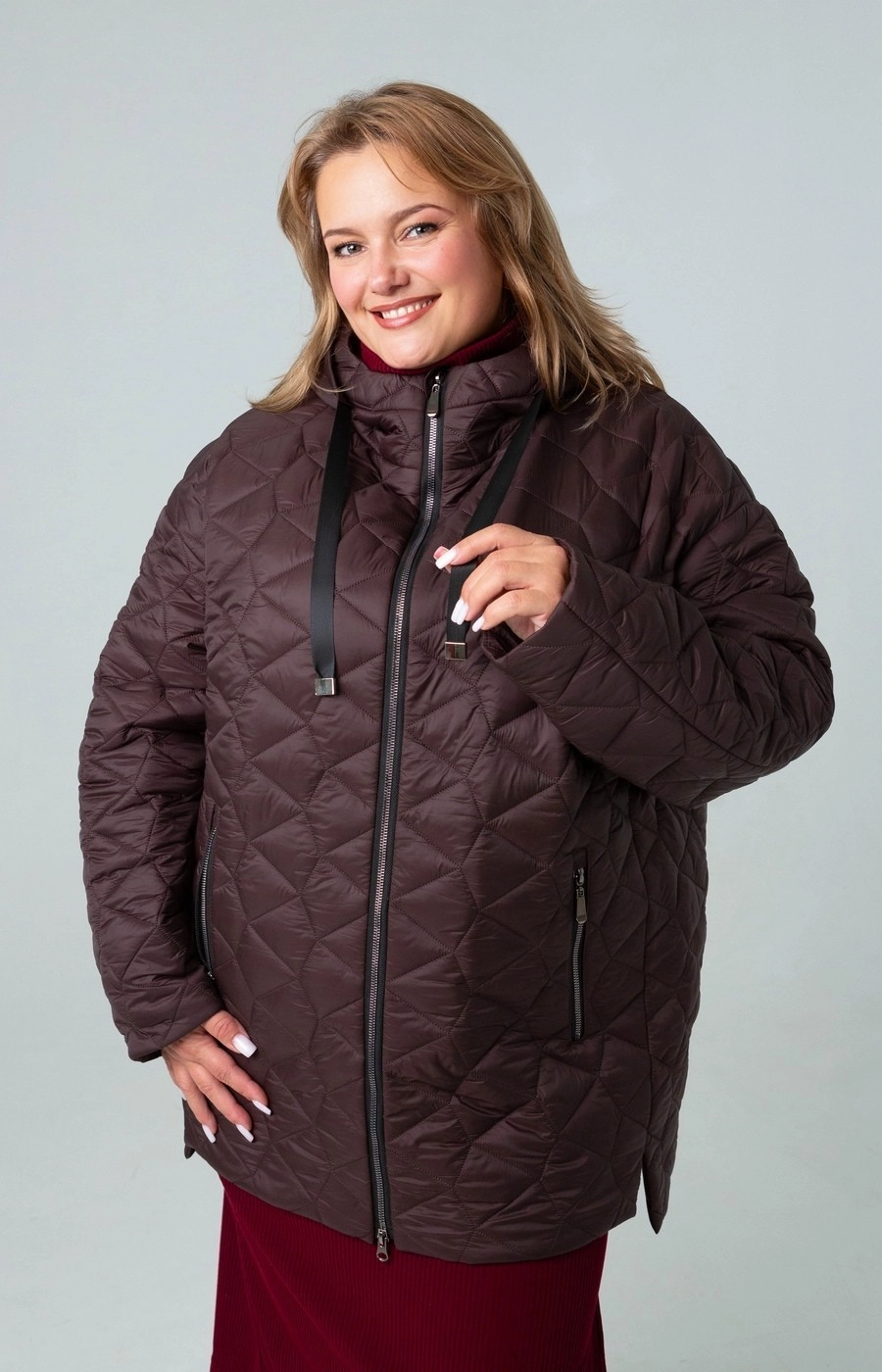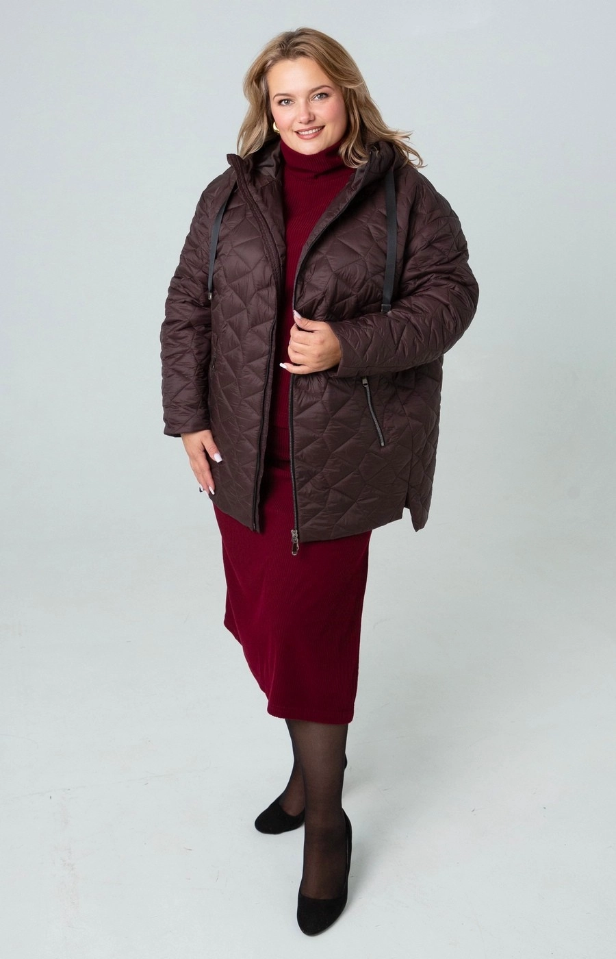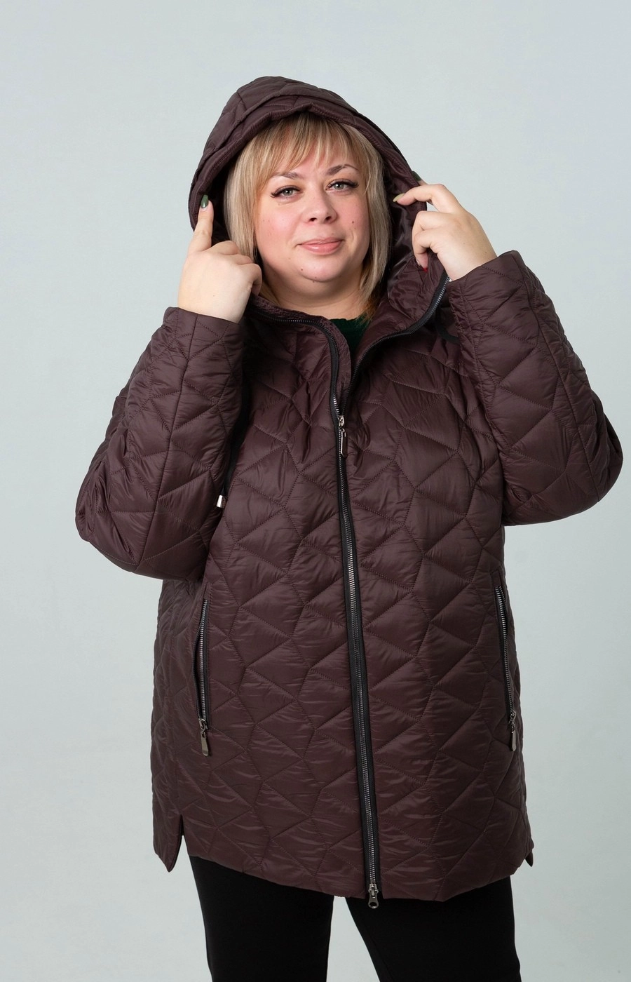 Женская стеганая куртка с застежкой на центральную молнию. Цельный капюшон. Цвет шоколадно-коричневый