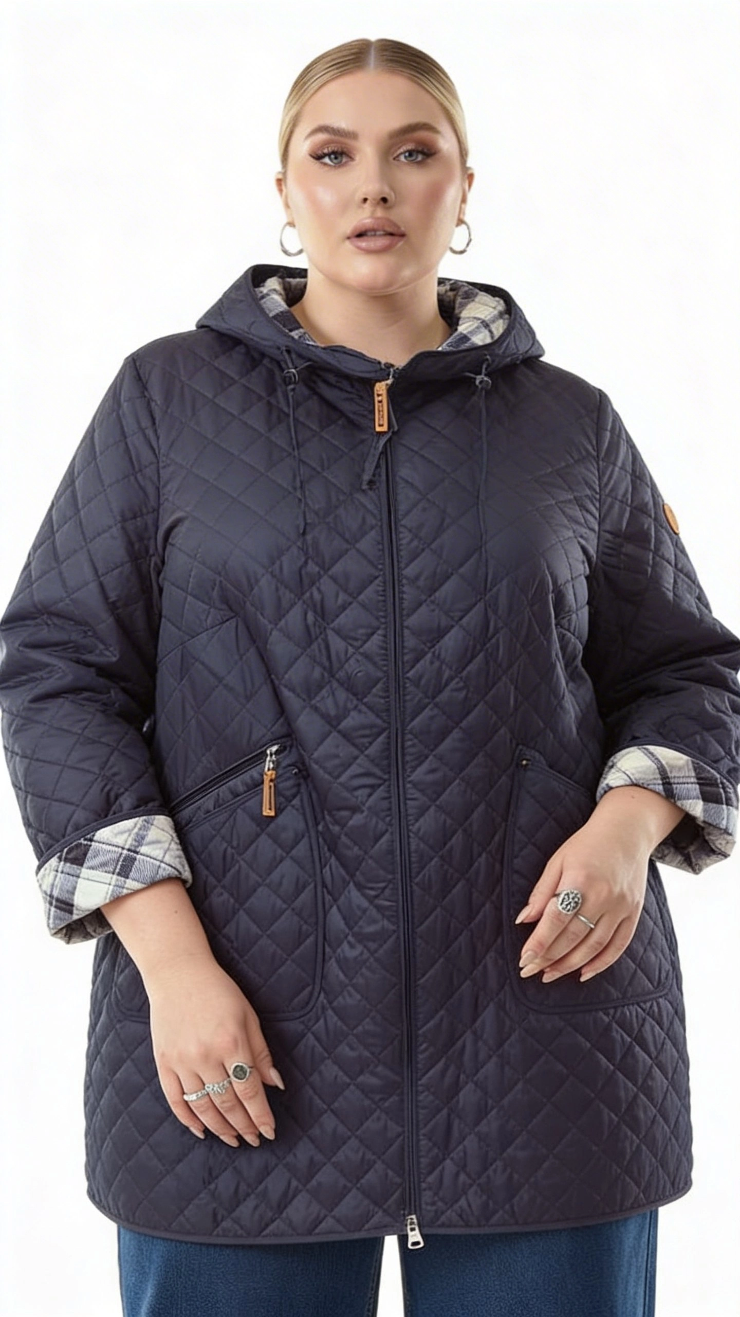 Стеганая куртка прямого свободного кроя с аккуратным капюшоном и диагональной стежкой создает лаконичный повседневный образ. Темно-синий цвет и однотонный дизайн легко вписываются в базовый гардероб для улицы и города. Впереди — центральная молния по всей длине, удобная для регулировки посадки и комфорта. Рукава с подворотом открывают контрастную клетчатую подкладку, добавляя спокойный акцент к образу. Мягко очерченная линия плеч и умеренная длина до бедра по кадру делают модель практичной для ежедневной носки с джинсами и другой casual-одеждой. Если нужен совет по размеру и посадке, подскажем по вашим параметрам и оформим доставку тем способом, который вам будет комфортен.