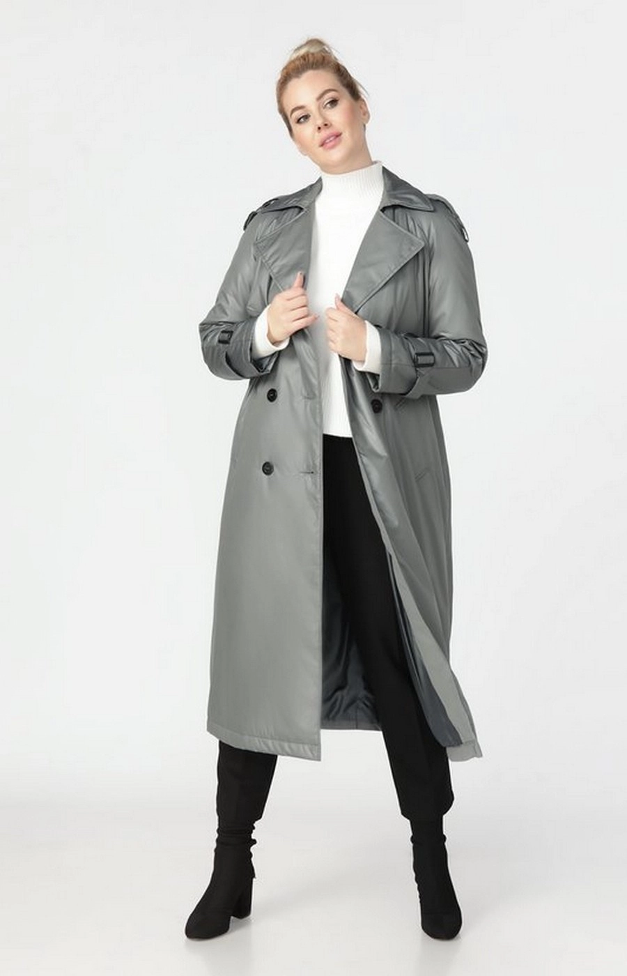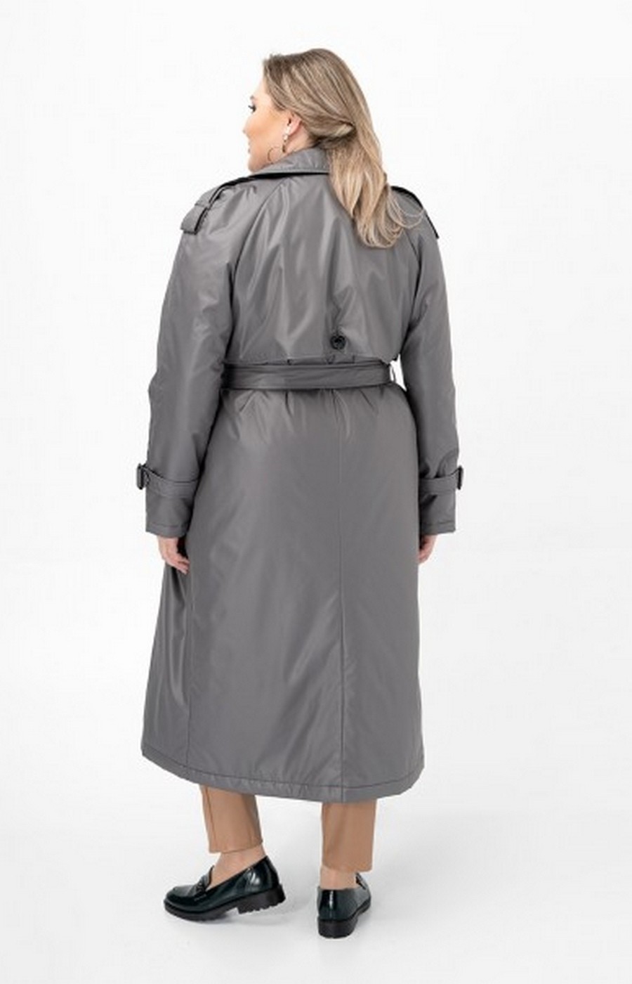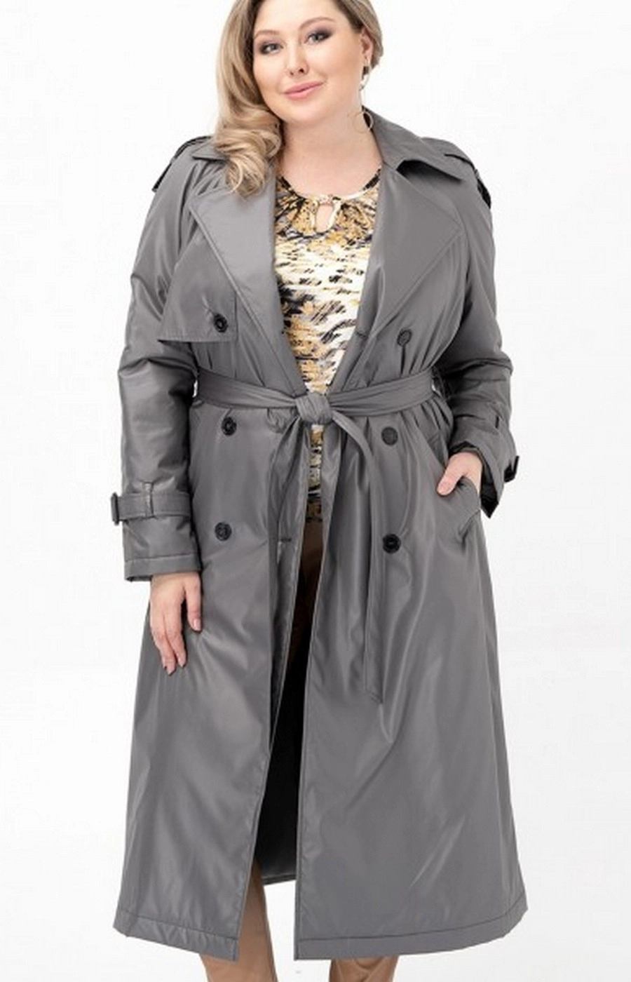 Утепленный женский плащ производства Россия. Цвет серый. Модель с застежкой на пуговицы и поясом