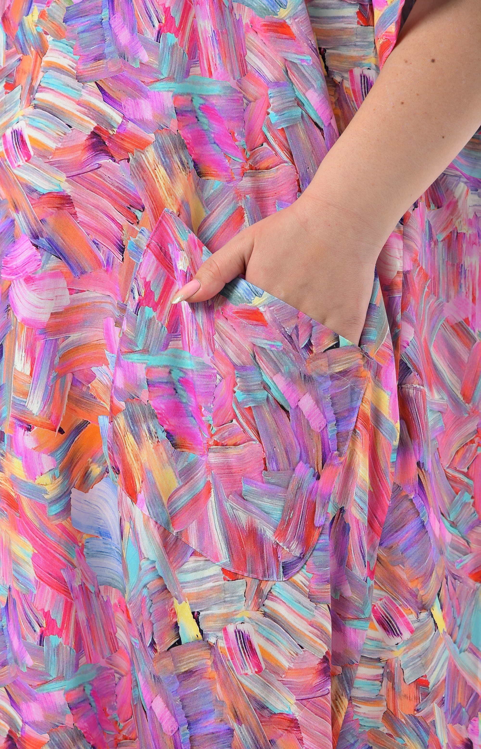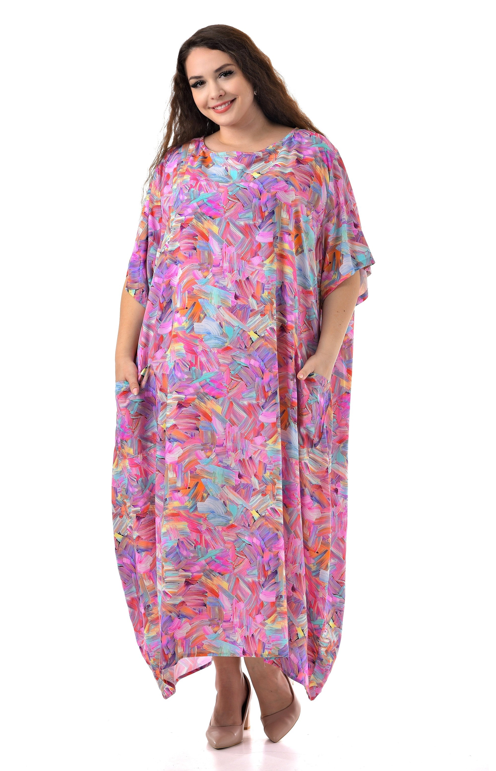Яркое легкое платье из качественного штапеля с элегантным рисунком. Модель с круглым вырезом горловины, удлинённая, свободного силуэта. По бокам два накладных кармана. Платье прекрасно подойдет для летних прогулок, а также его можно носить дома или на пляж