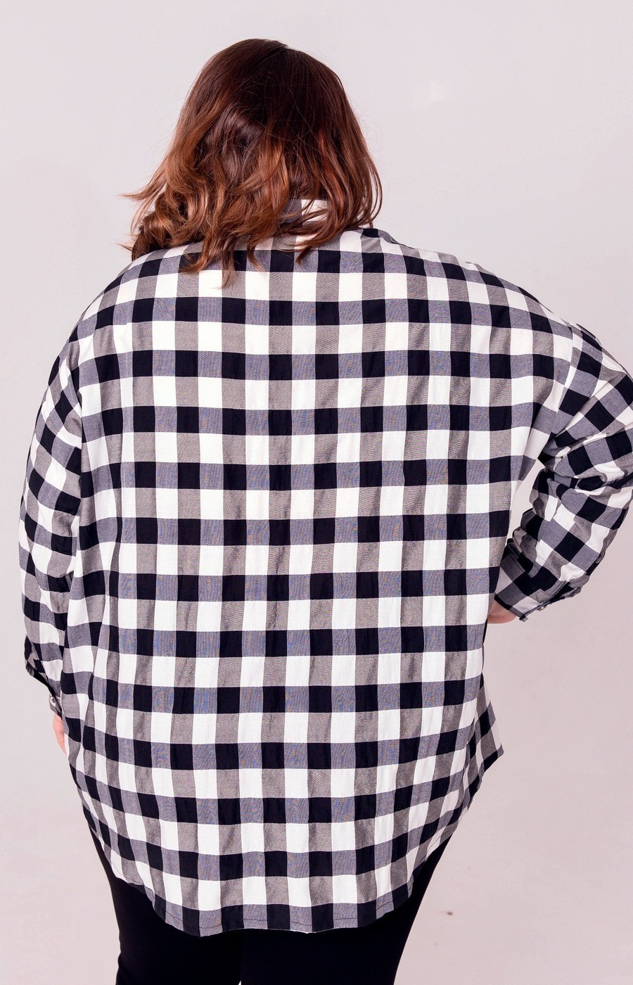Рубашка в черно-белую клетку женская — практичный выбор для формирования базового гардероба и создания актуальных многослойных образов. Эта модель свободного прямого кроя отличается просторной посадкой, которая не ограничивает движений и мягко очерчивает силуэт. Конструкция изделия включает спущенную линию плеча и длинные рукава, завершающиеся классическими манжетами. Центральная застежка оформлена рядом контрастных пуговиц, переходящих в аккуратный отложной воротник. Выразительный геометрический рисунок добавляет динамики, а длина ниже линии бедер позволяет носить рубашку навыпуск в сочетании с брюками или джинсами. Лаконичный дизайн без нагрудных карманов и лишних декоративных элементов делает вещь универсальной для городского стиля и отдыха.