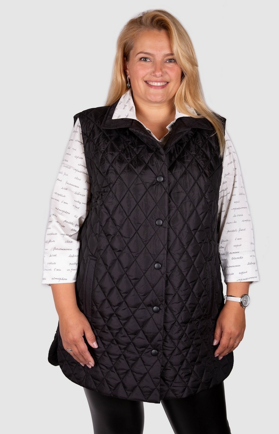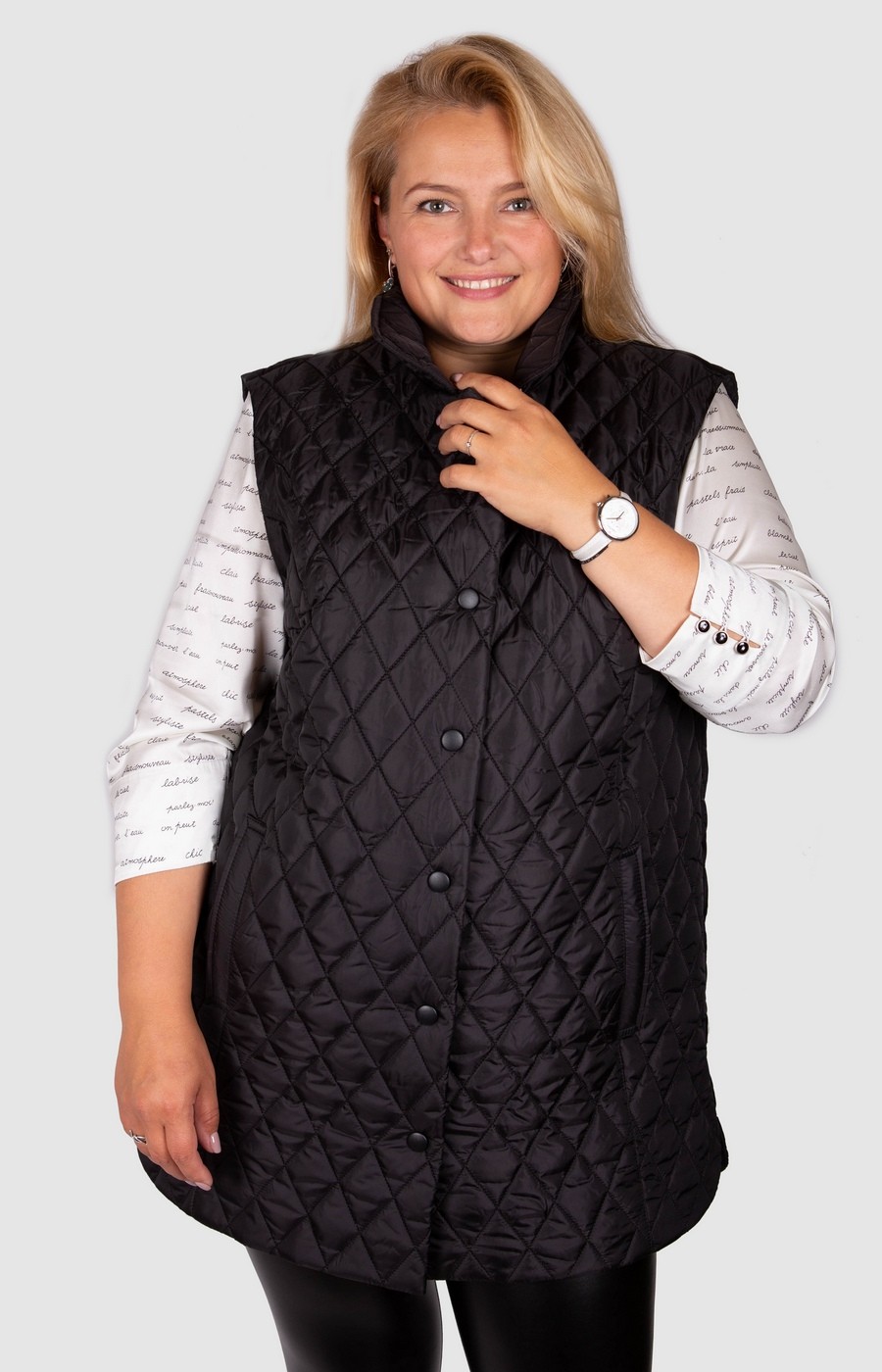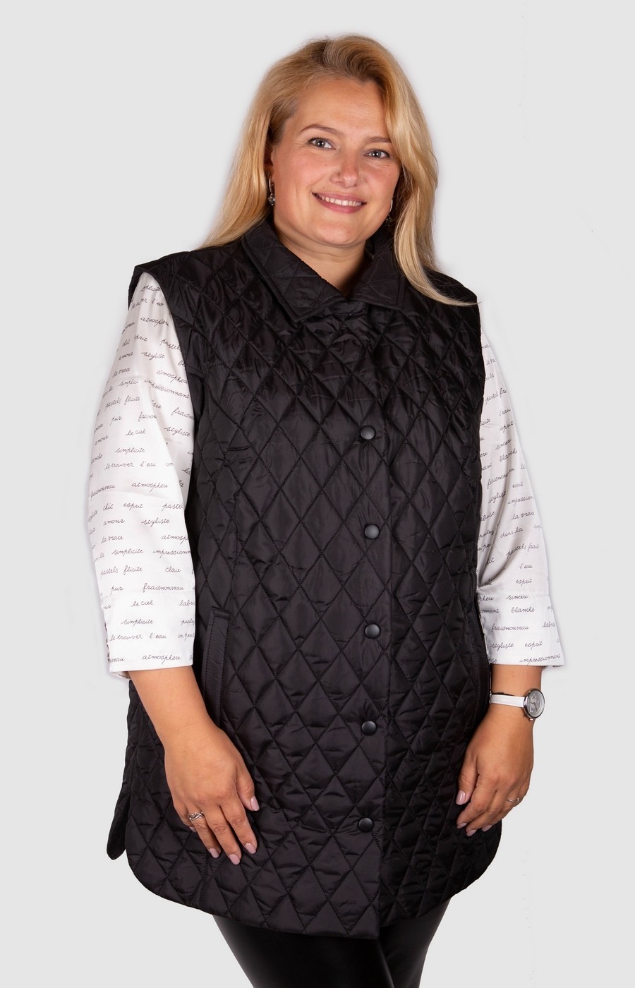 Удлиненный стеганый жилет черного цвета. Застежка на кнопки. Два прорезных кармана. Универсальная и многофункциональная модель