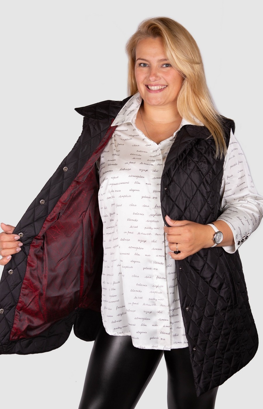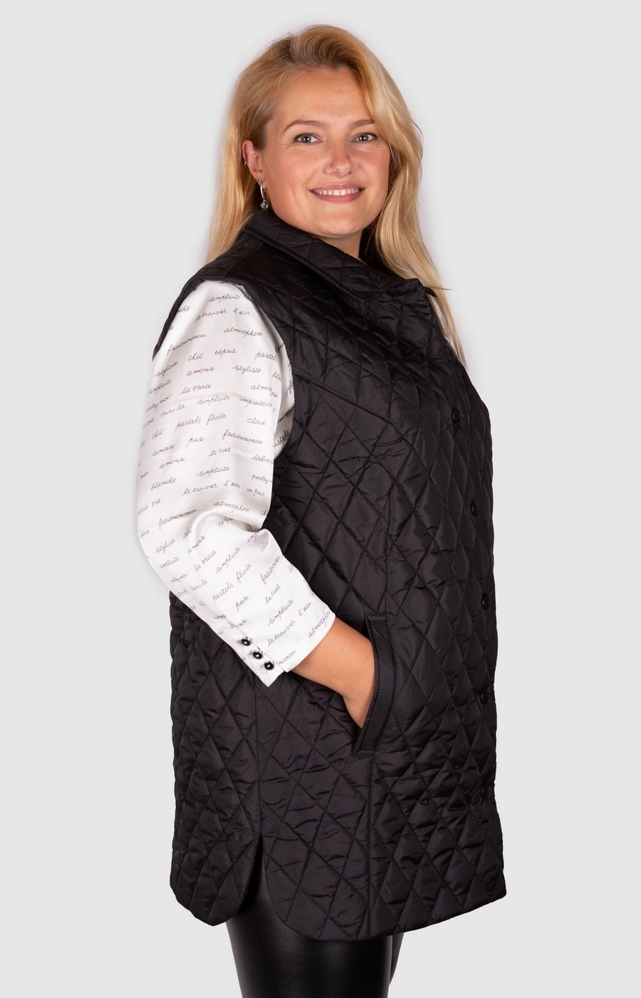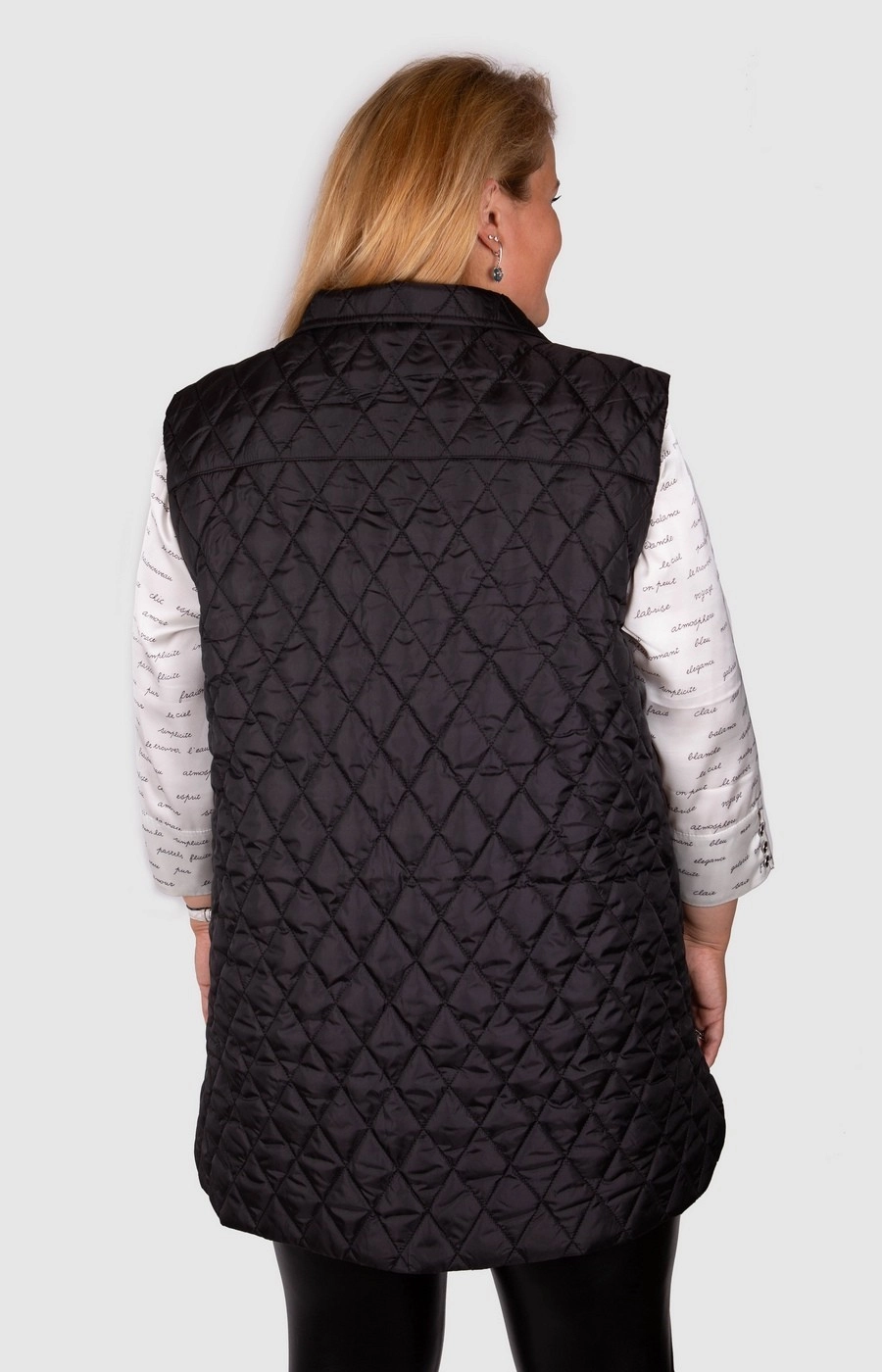 Удлиненный стеганый жилет черного цвета. Застежка на кнопки. Два прорезных кармана. Универсальная и многофункциональная модель