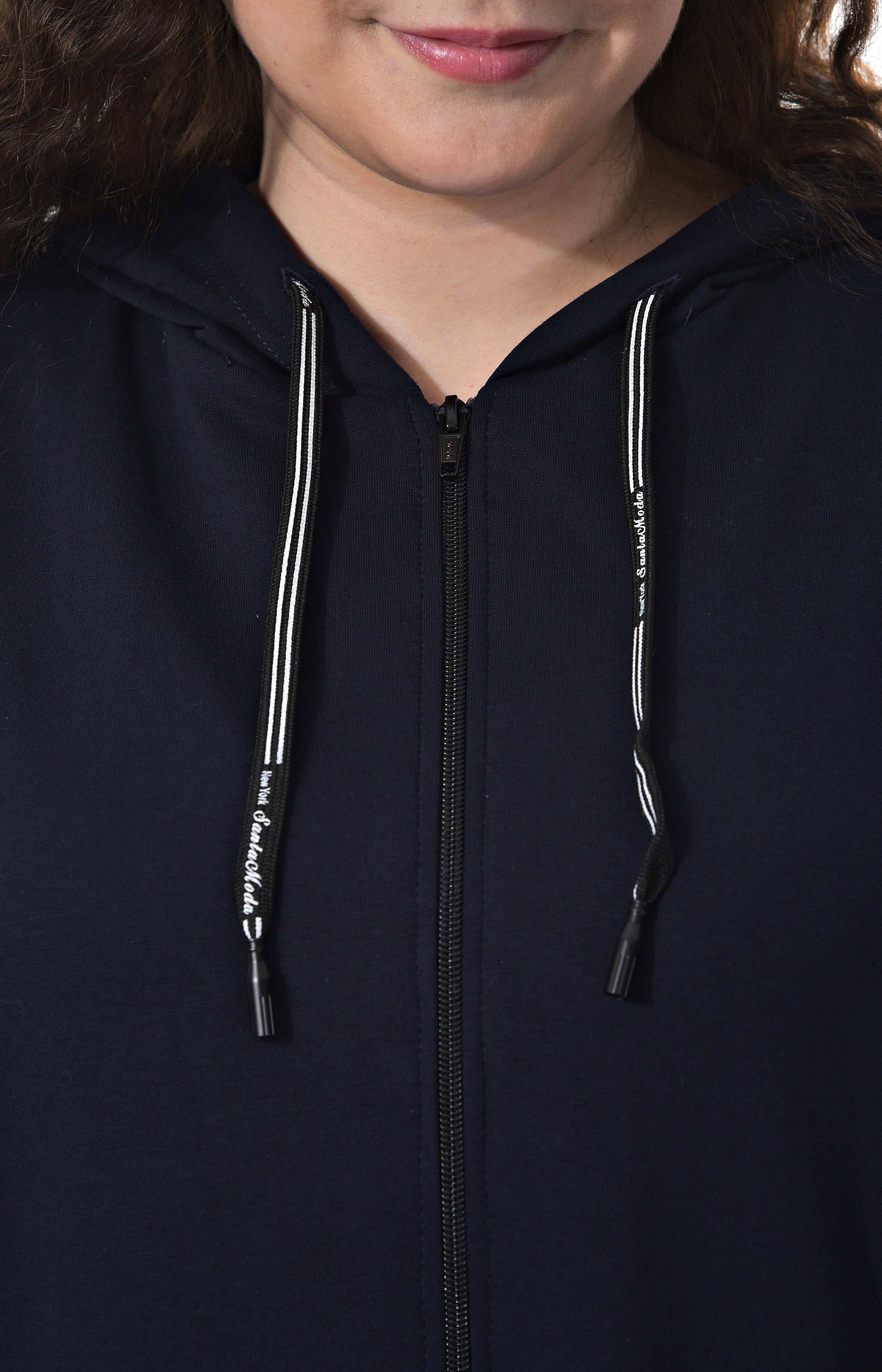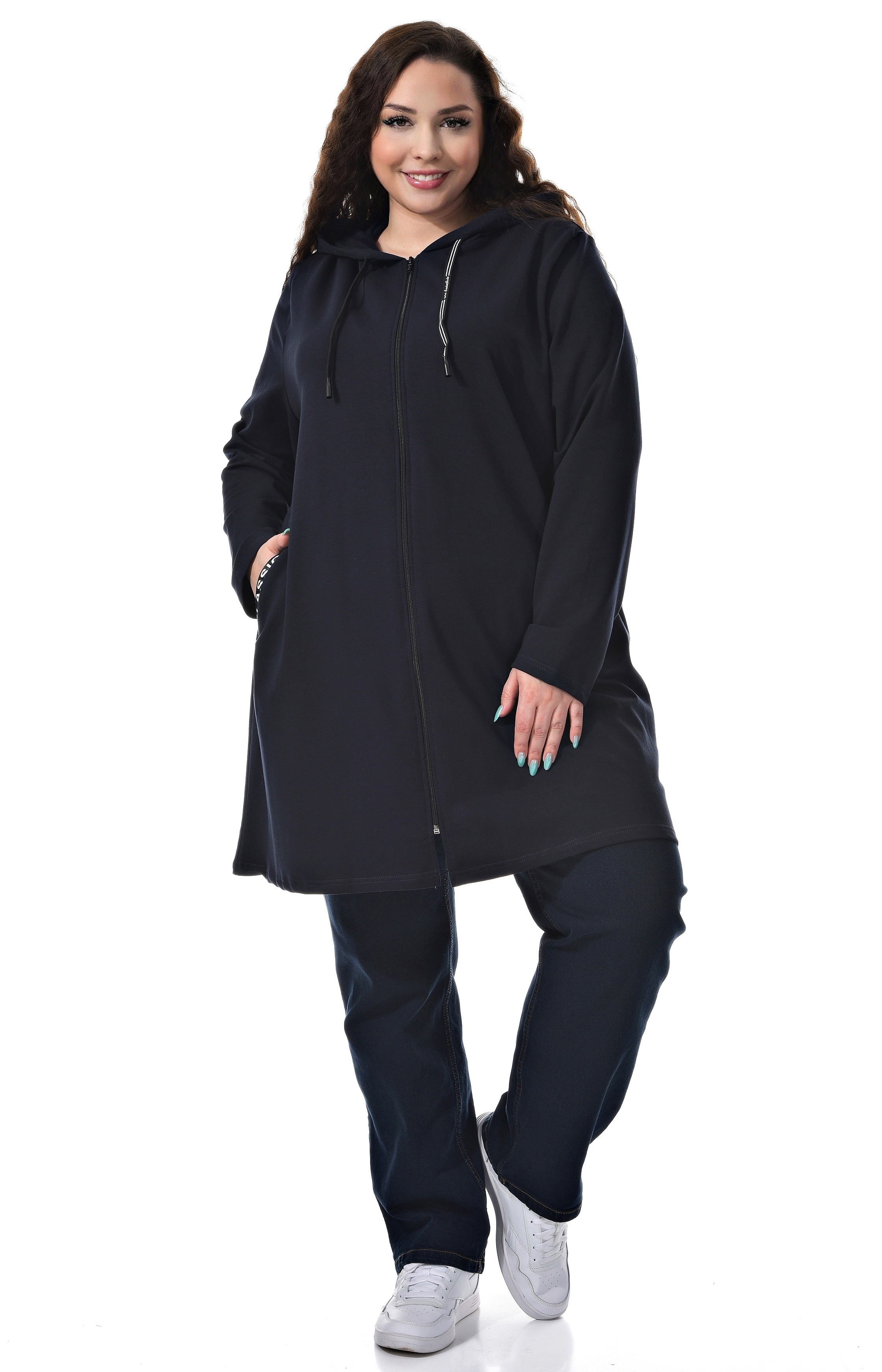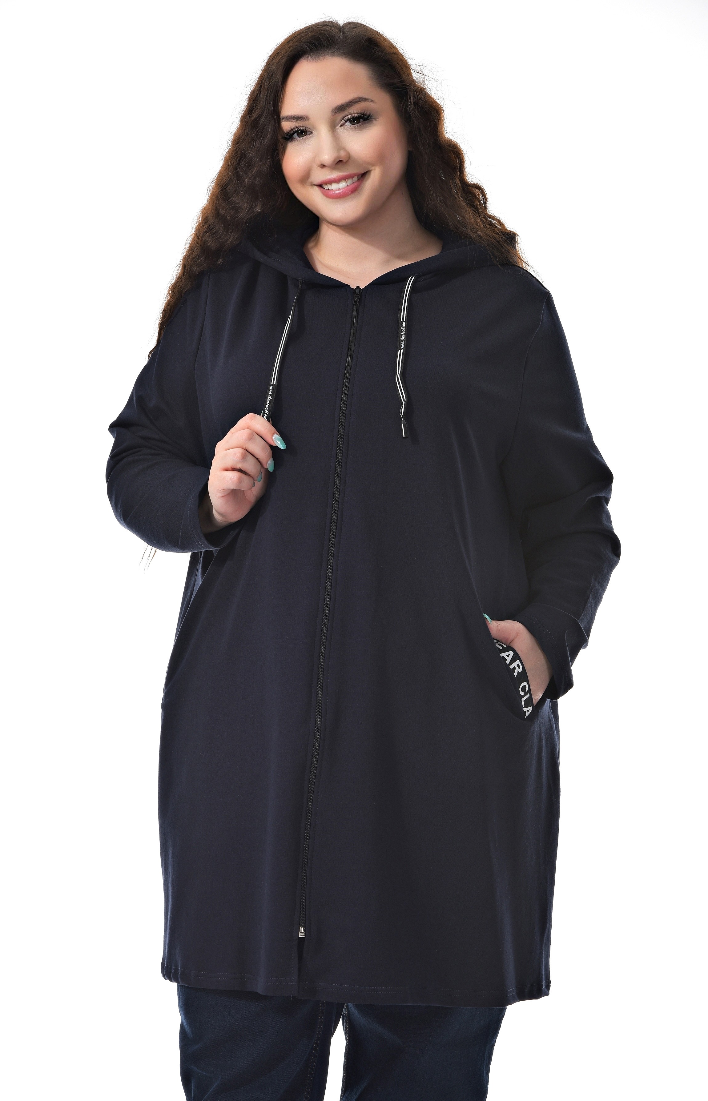 Удлиненная женская толстовка на молнии. Цвет темно синий. Стильный шнурок по вороту. Отделка лентой с принтом по карману. Модель можно одевать как толстовку или ветровку. Прекрасно сочетается с джинсами, брюками и лосинами