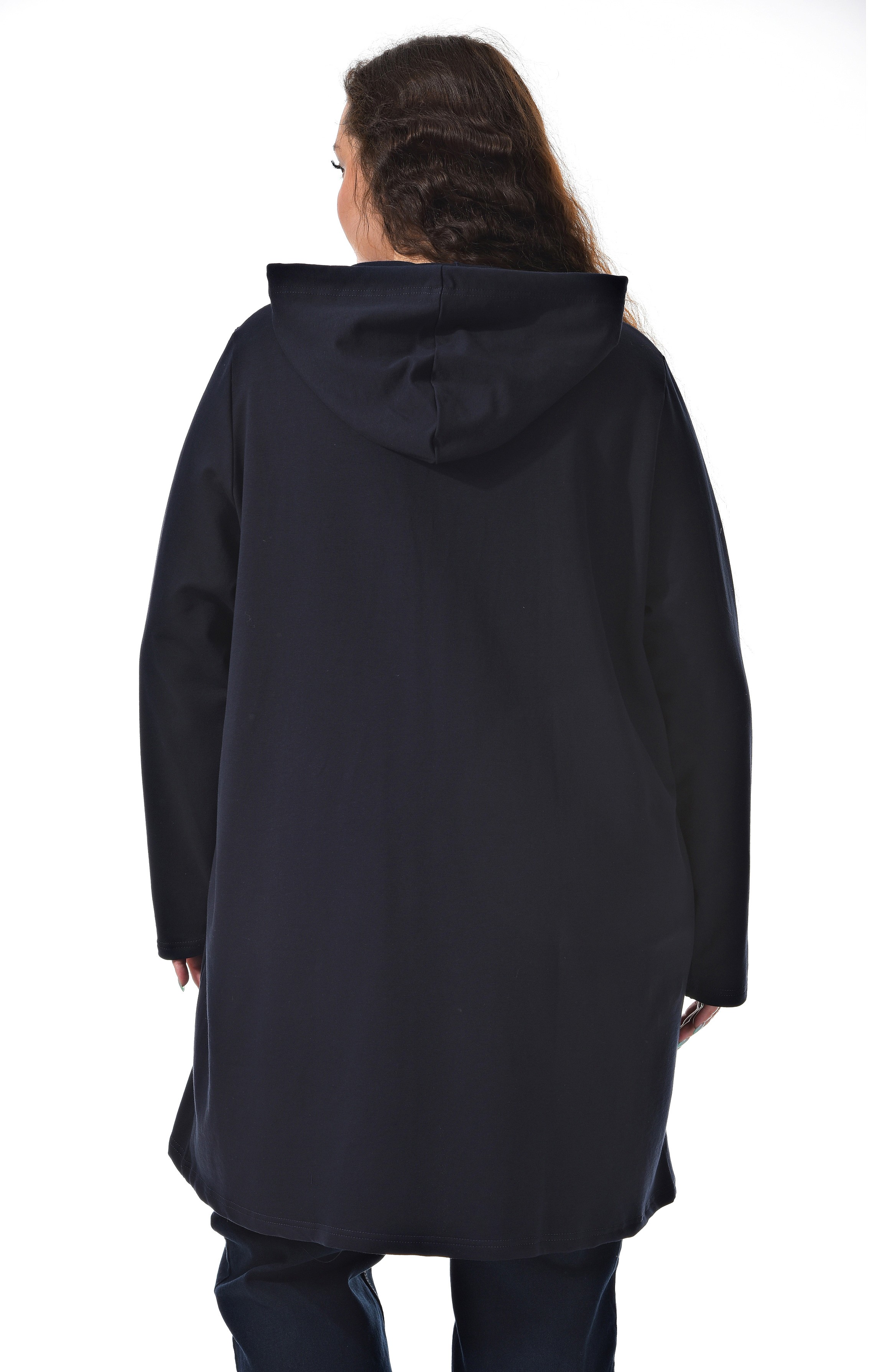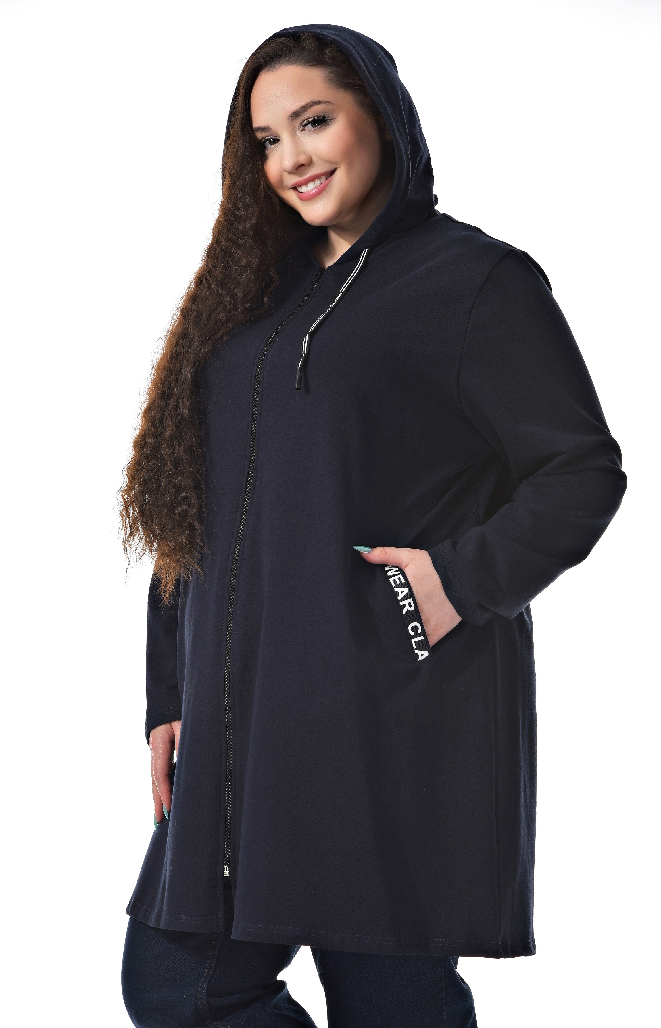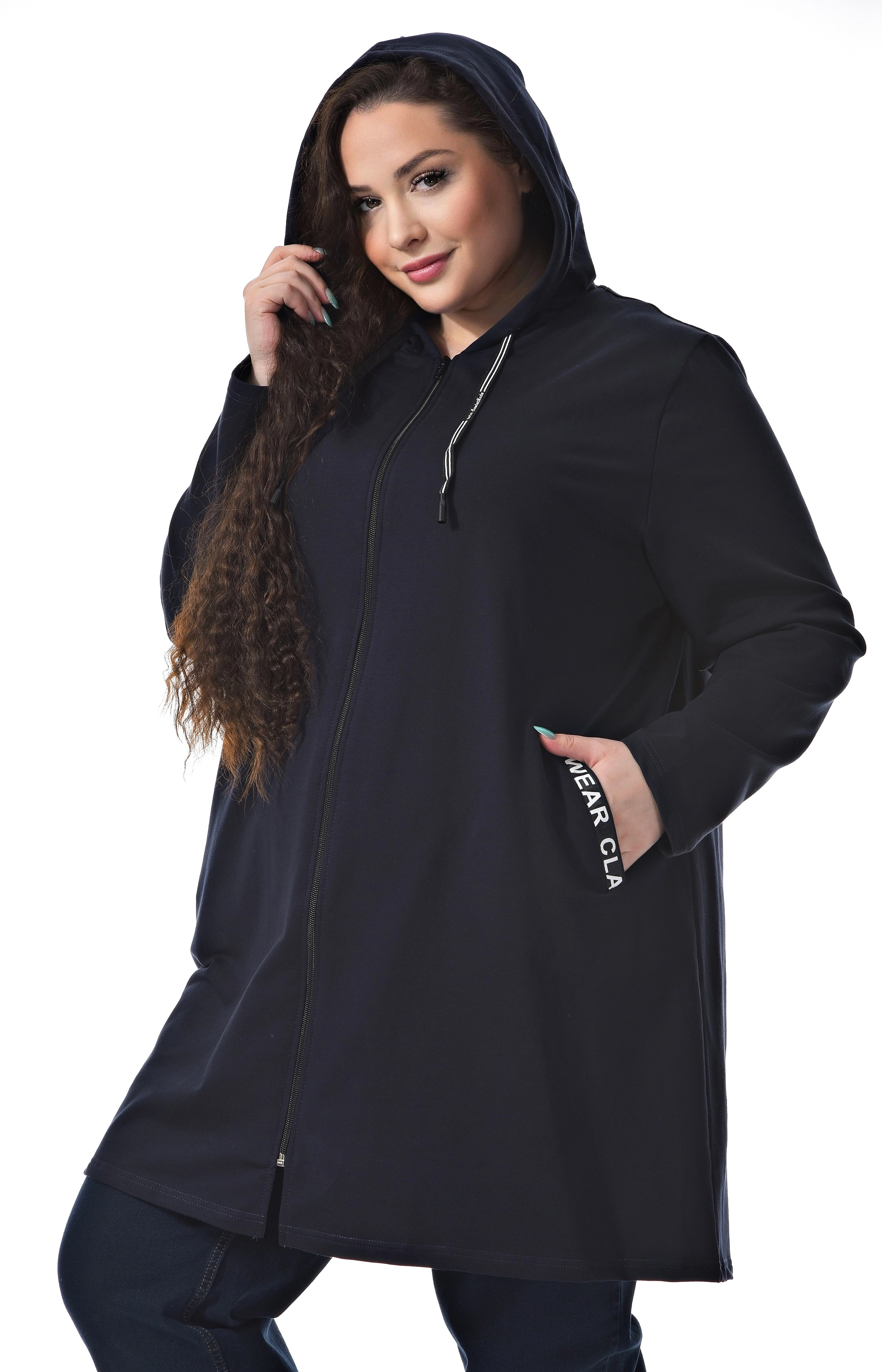 Удлиненная женская толстовка на молнии. Цвет темно синий. Стильный шнурок по вороту. Отделка лентой с принтом по карману. Модель можно одевать как толстовку или ветровку. Прекрасно сочетается с джинсами, брюками и лосинами