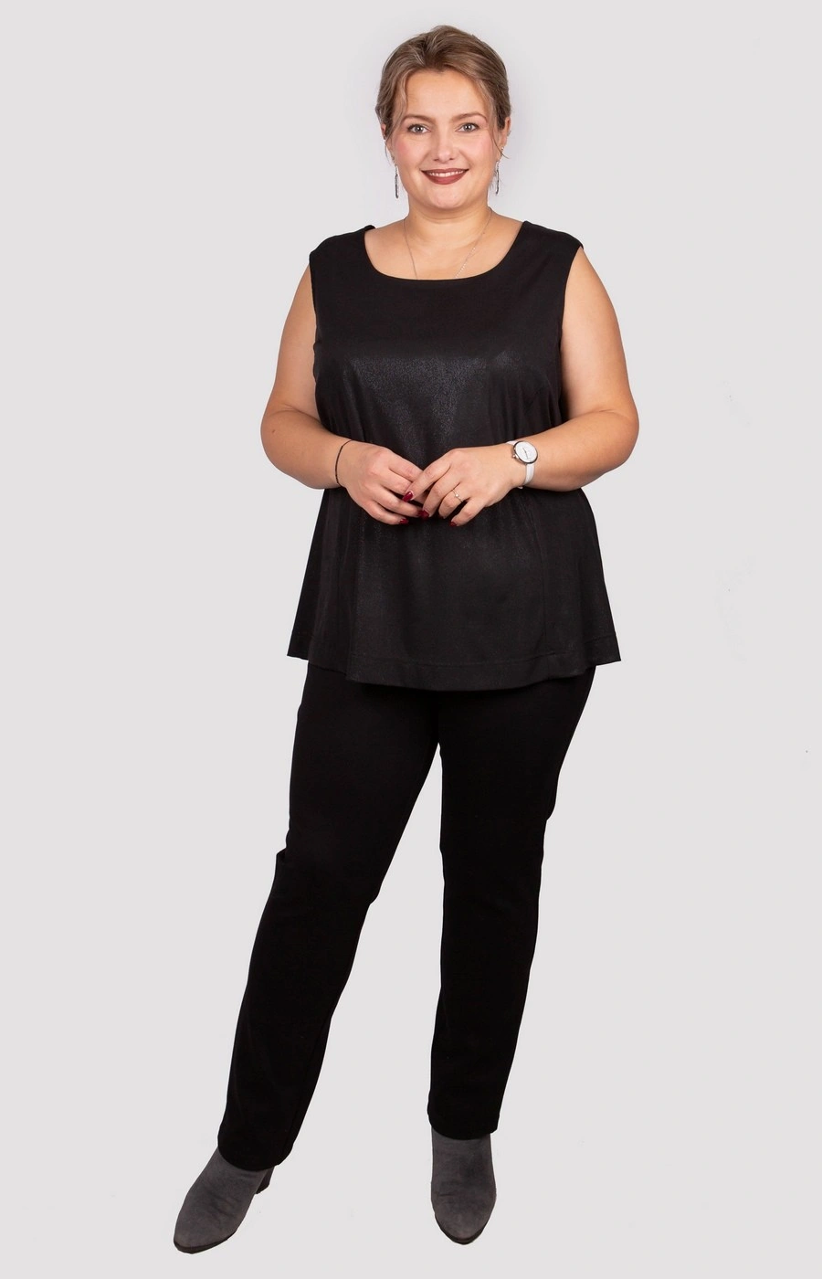 Топ женский с округлым вырезом - идеальный базовый образ для каждой современной женщины. Цвет черный с небольшим люрексом. Свободный крой делает топ максимально комфортным в носке. Вырезы по бокам придают модели лаконичности.