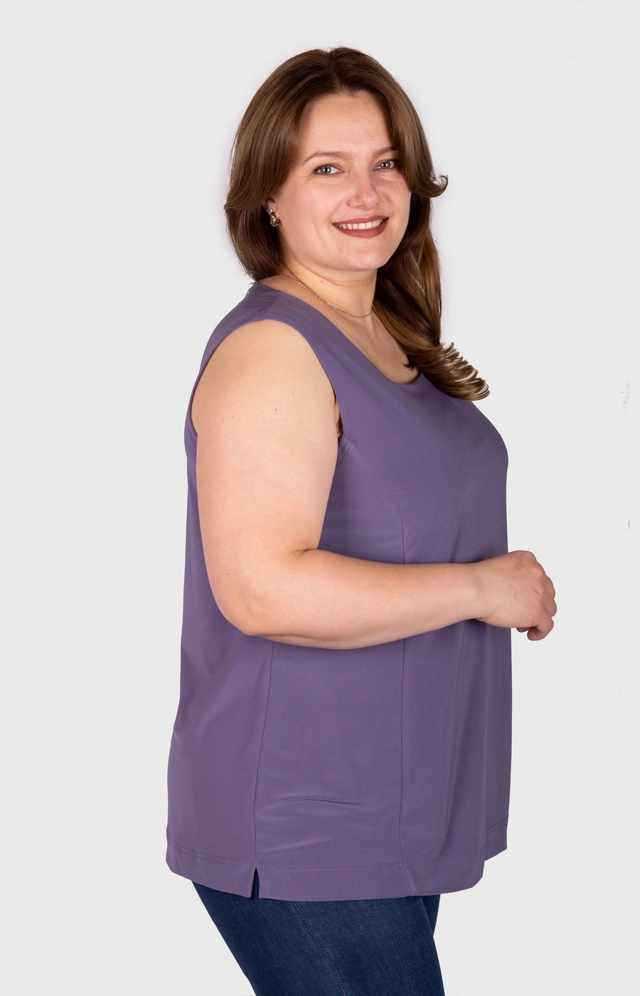 Топ женский с округлым вырезом - идеальный базовый образ для каждой современной женщины. Цвет фиолетовый. Свободный крой делает топ максимально комфортным в носке. Вырезы по бокам придают модели лаконичности.