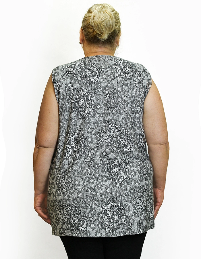 Серый топ без рукавов с округлой горловиной выполнен в свободном силуэте и комфортно ложится по фигуре, не стесняя движения. Мягкая линия плеч и слегка расклешённый низ создают аккуратную посадку по бедру, а длина по кадру закрывает верхнюю часть брюк. Нейтральный серый фон с разбросанным контрастным принтом придаёт модели повседневный характер и легко сочетается с однотонными джинсами или простыми брюками для города и отдыха. Ткань визуально выглядит гладкой, топ держит форму без лишних деталей и подходит для спокойных, ненагруженных аксессуарами образов. Если нужен совет по выбору, подскажем размер и посадку по вашим меркам и организуем доставку удобным для вас способом.