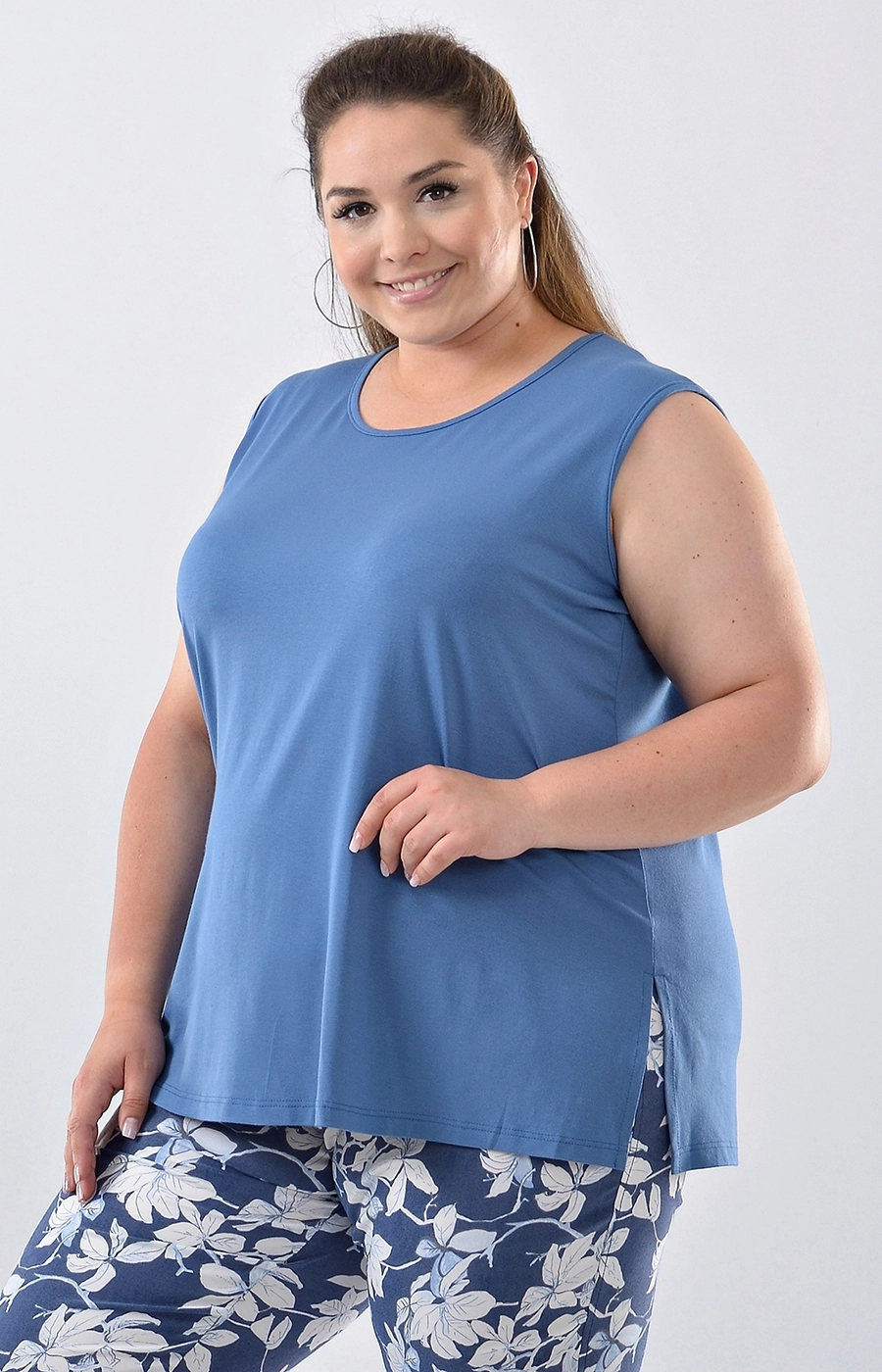 Голубой топ свободного силуэта с ровной линией плеча и круглой горловиной подчёркивает лаконичность повседневного образа в стиле casual. Однородный голубой цвет и гладкая фактура ткани создают аккуратный, собранный вид, а удлинённая длина по кадру комфортно прикрывает линию бёдер и легко сочетается с брюками или джинсами. Мягкие проймы без рукавов обеспечивают свободу движений, топ без видимых застёжек надевается через голову и остаётся практичным вариантом для дома, прогулок и отдыха. Если важно уточнить посадку по объёму и длине именно под ваши параметры, поможем с подбором размера и организуем доставку удобным для вас способом.