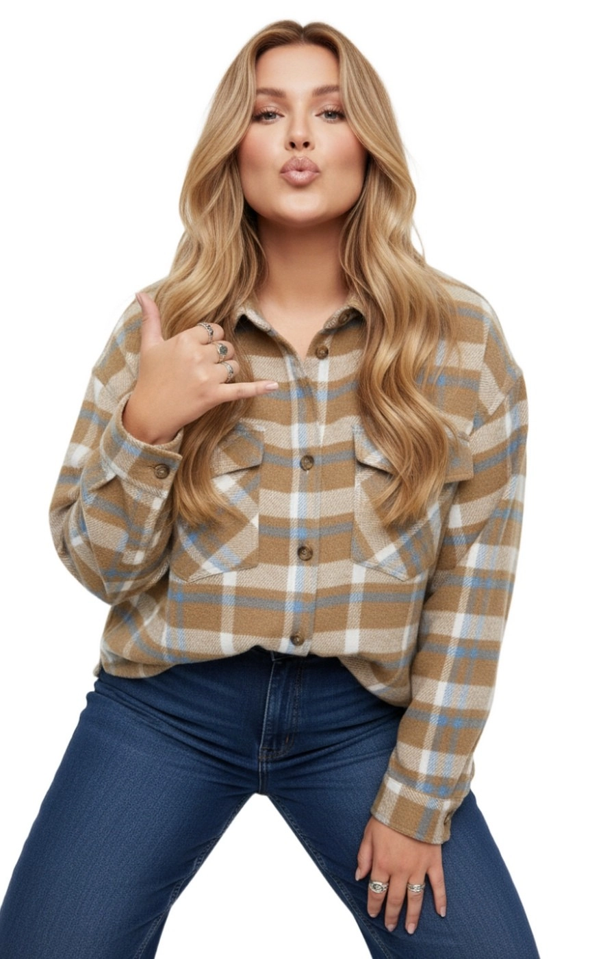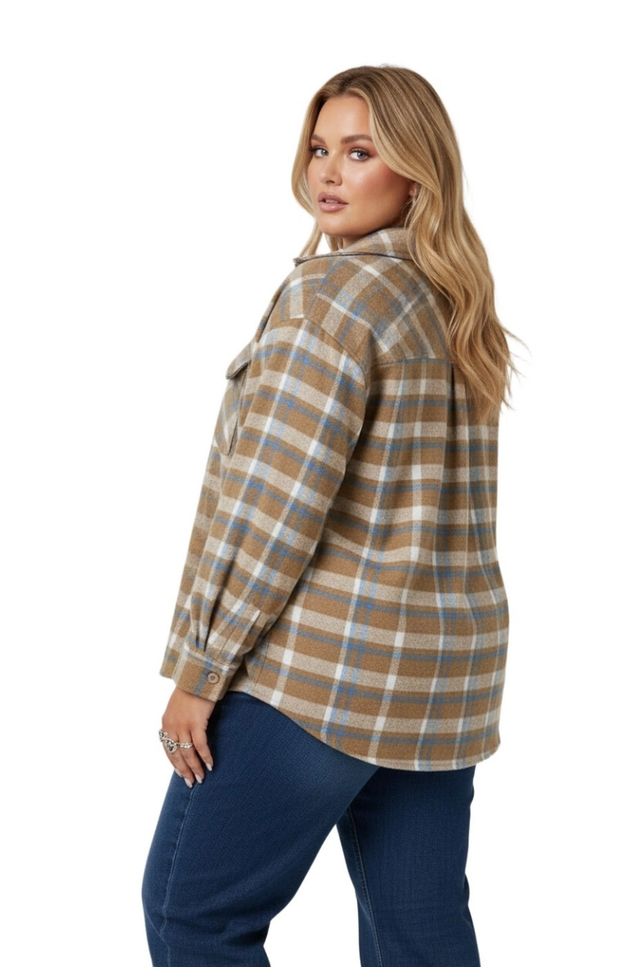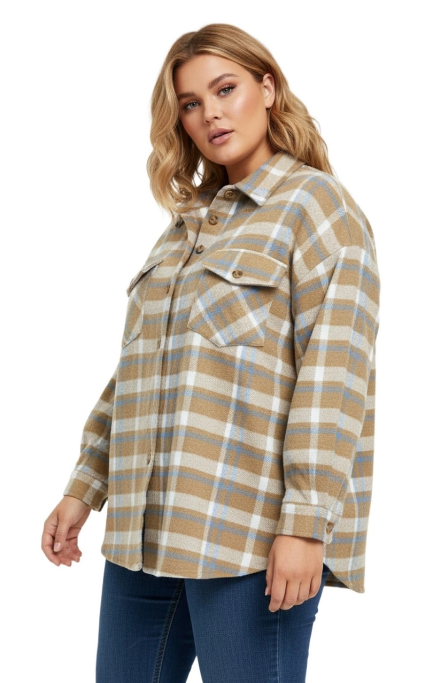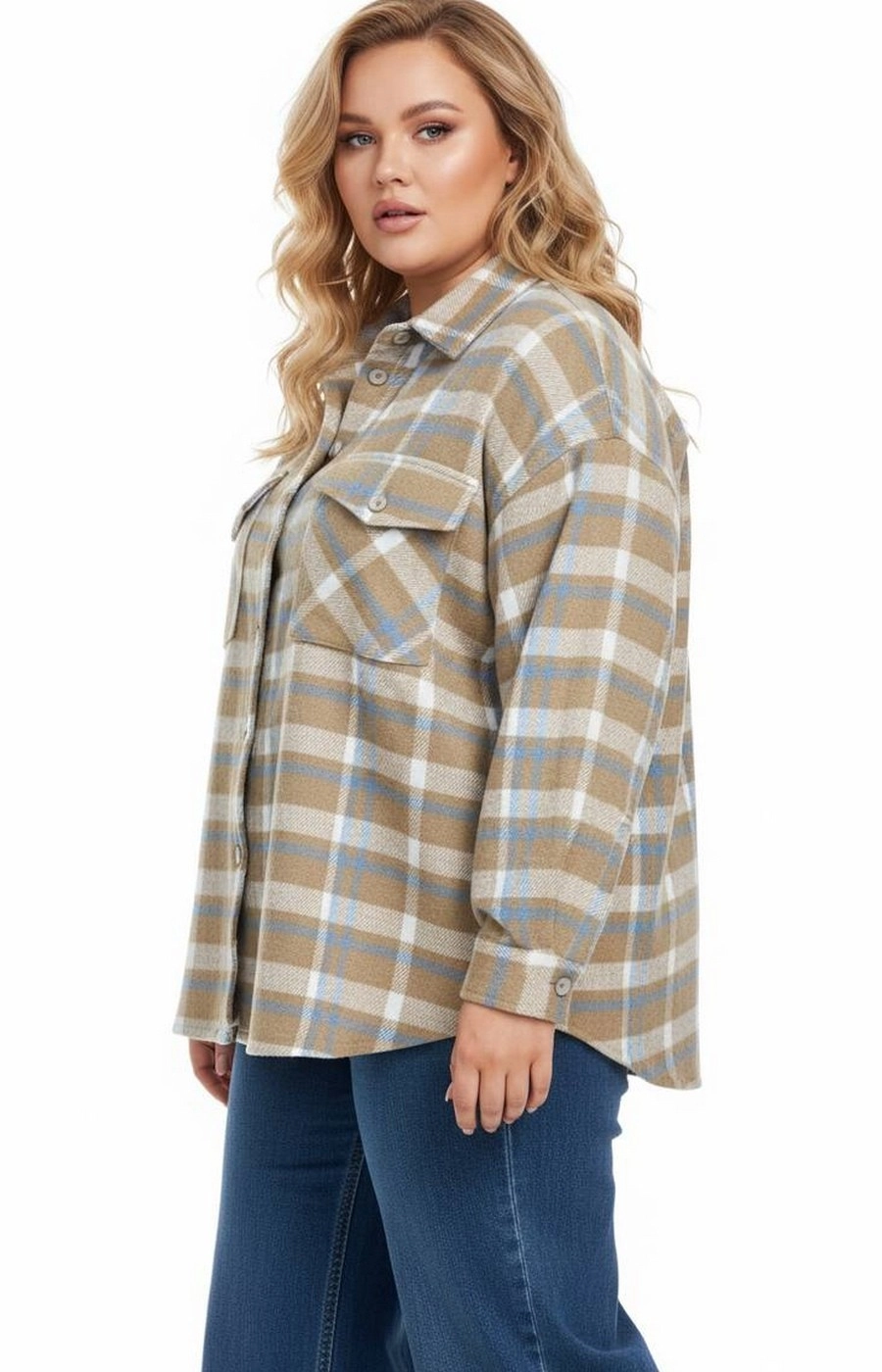 Рубашка-ветровка прямого свободного кроя с удлинённой линией до бедра создаёт аккуратный повседневный образ. Вещь выполнена в крупную клетку с сочетанием бежевого, голубого и белого цвета, что делает принт выразительным и самодостаточным. Классический отложной воротник и ровная планка на пуговицах поддерживают лаконичный стиль, а длинные рукава и мягкая по фактуре ткань добавляют ощущения комфорта. Нагрудные клапаны на пуговицах визуально структурируют зону плеч и поддерживают собранный силуэт для города, прогулок и отдыха. Подскажем подходящий размер и посадку по вашим меркам, а рубашку-ветровку доставим удобным для вас способом — просто напишите нам перед оформлением заказа