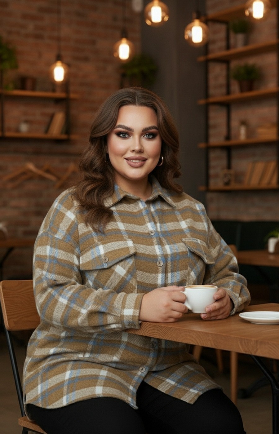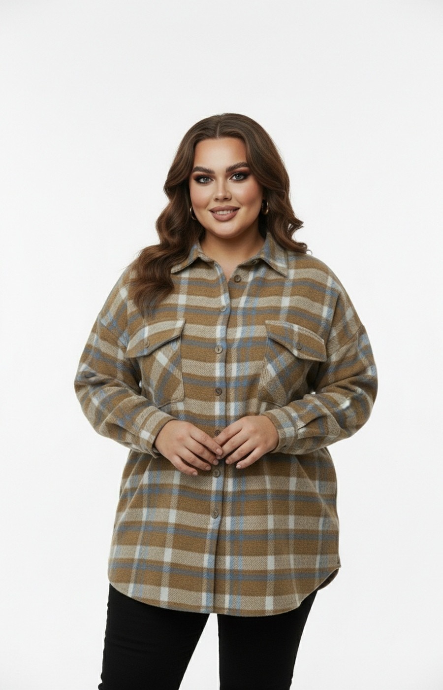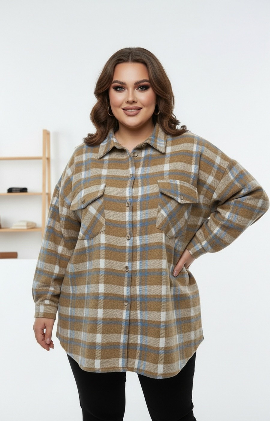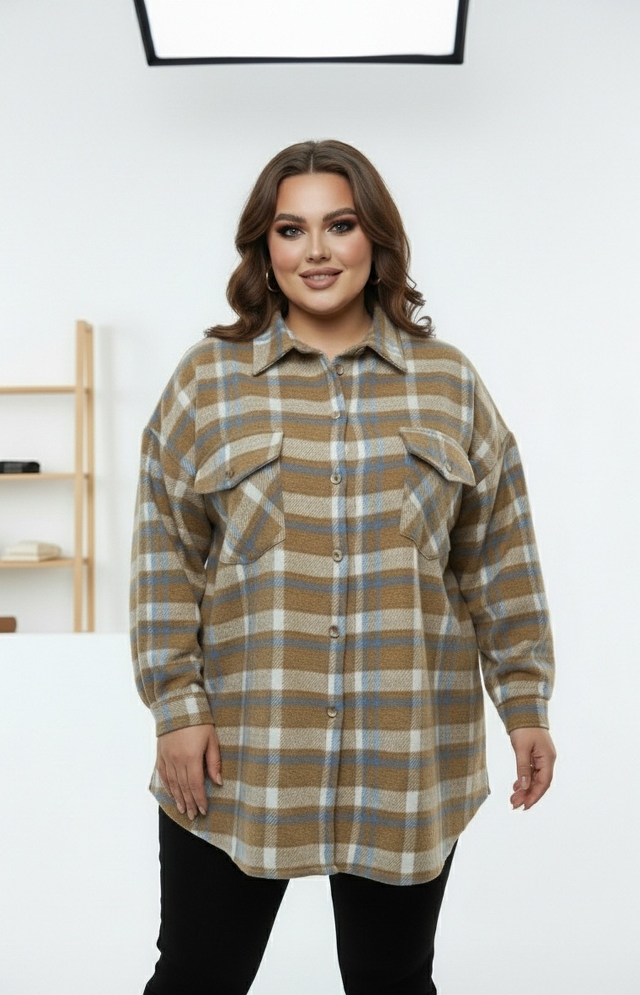 Женская рубашка-ветровка в клетку в бежевой цветовой гамме. Застежка на пуговицы. Очень удобная модель.