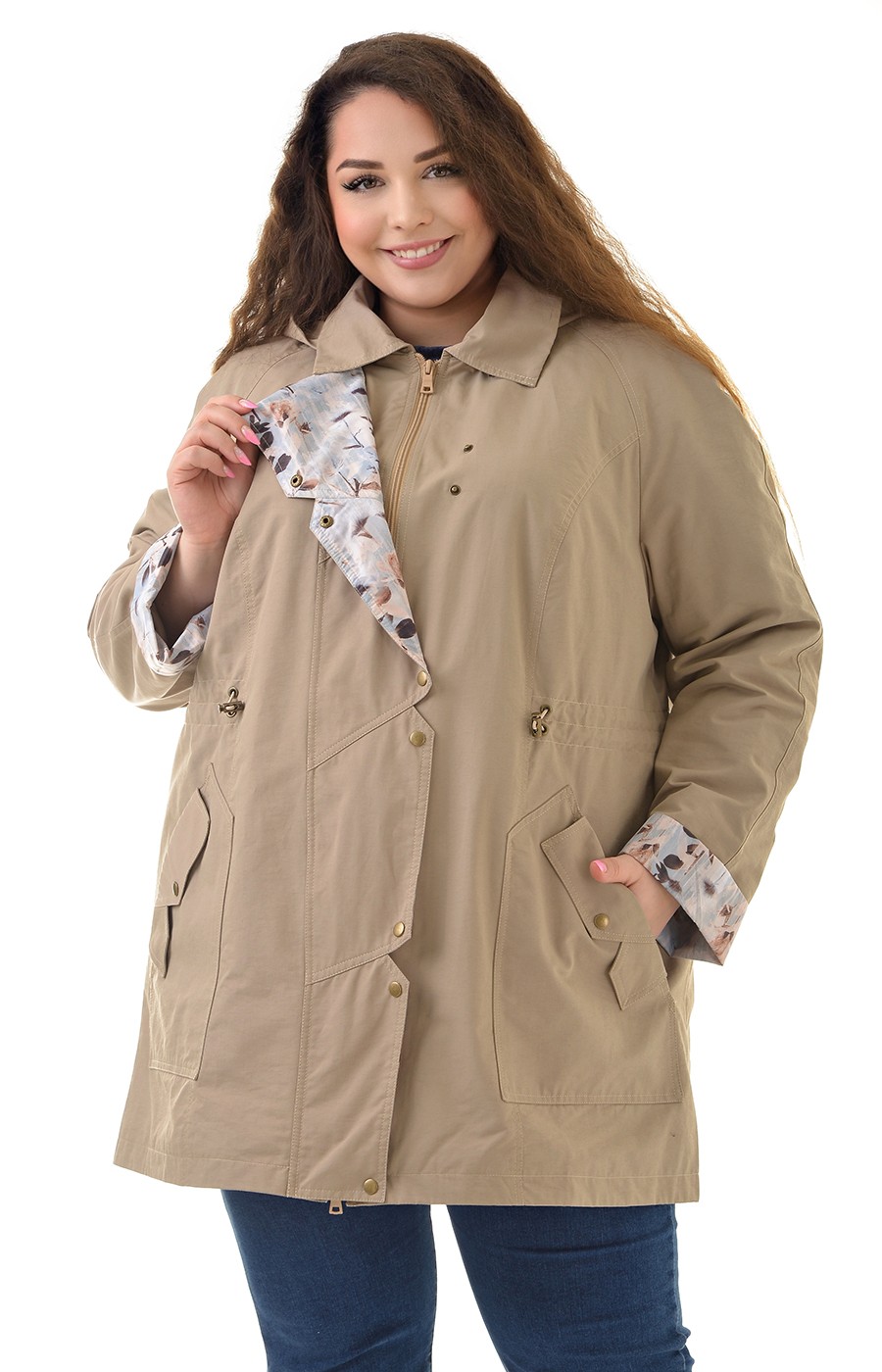 Женская ветровка больших размеров "Большие люди" в бежевом цвете с контрастной отделкой — практичная демисезонная верхняя одежда из хлопкосодержащей ткани с водоотталкивающим эффектом (верх 70% хлопок, 30% полиэстер, подкладка 100% поливискоза). Весенняя куртка-ветровка с водоотталкивающей пропиткой защищает от дождя и ветра. Контрастная отделка по планке и манжетам добавляет стильный спортивный акцент. Бежевый цвет — элегантный нейтральный оттенок для весенне-осеннего гардероба.
