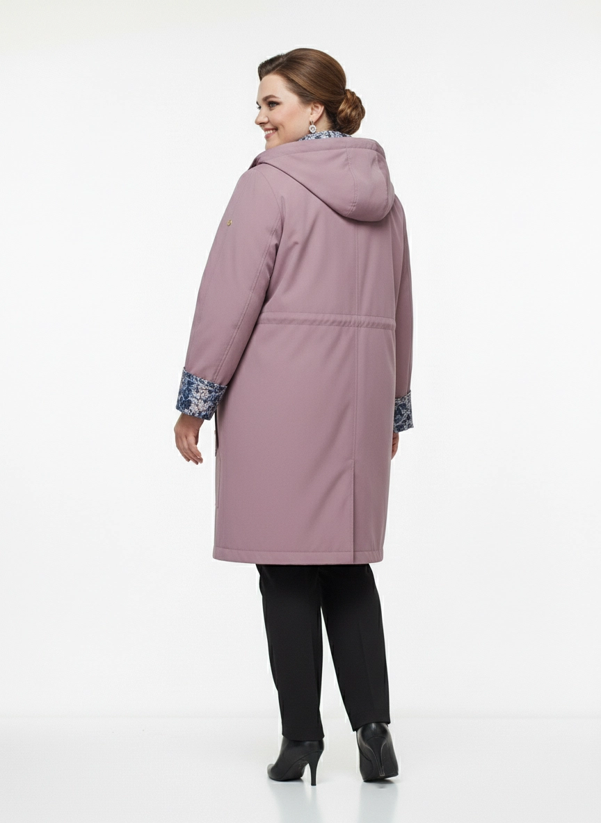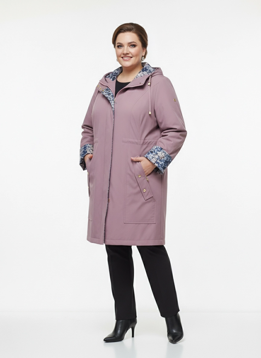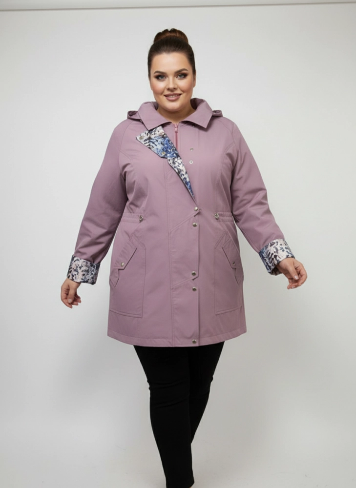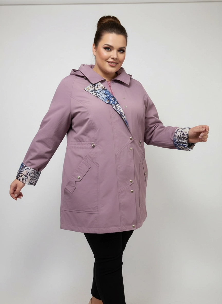 Женская удлиненная ветровка plus size в приглушенном лиловом цвете выполнена в свободном прямом силуэте, который обеспечивает комфортную посадку и не стесняет движения в повседневных образах. Гладкая ткань визуально держит форму, а центральная застежка на молнию в сочетании с планкой на кнопках надежно фиксирует изделие по всей длине. Капюшон с аккуратной линией выреза и небольшим козырьком помогает чувствовать себя комфортно на улице, по линии талии расположены утяжки, позволяющие мягко скорректировать объем и создать более собранный образ без лишних деталей. Отвороты рукавов и внутренняя планка с контрастным принтом добавляют парке женственный акцент и делают лаконичный городской стиль более выразительным, хорошо сочетаясь с прямыми брюками или джинсами для прогулок, поездок и деловых будней. Перед оформлением заказа подскажем размер и посадку по вашим меркам, организуем удобную доставку и при необходимости оформим обмен или возврат по правилам магазина, чтобы покупка этого изделия была спокойным и продуманным решением.